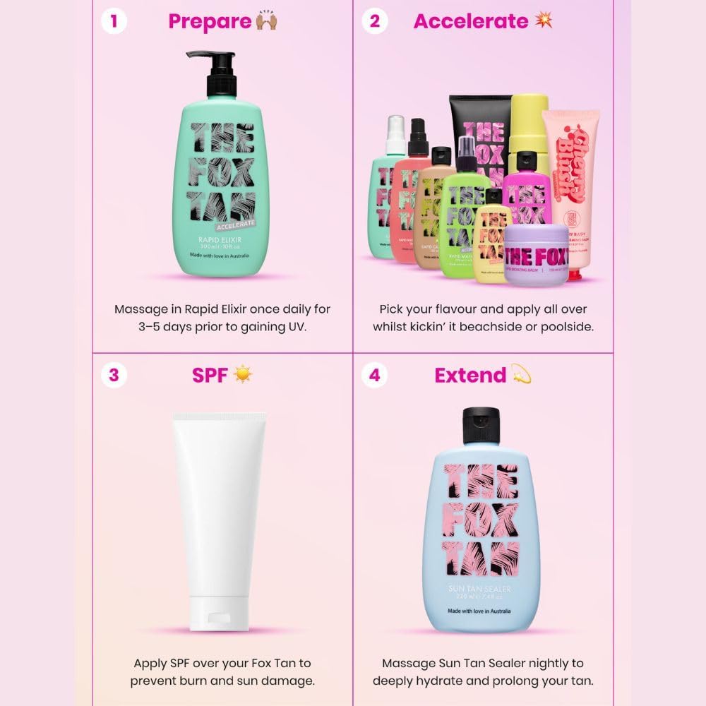 VOORBEREIDING: Gebruik Rapid Tanning Elixir (100 ml) in de dagen voorafgaand aan het zonnebaden; 3-5 dagen voor het zonnebaden dagelijks aanbrengen en in de tussentijd blijven gebruiken om uw melanineproductie te ondersteunen