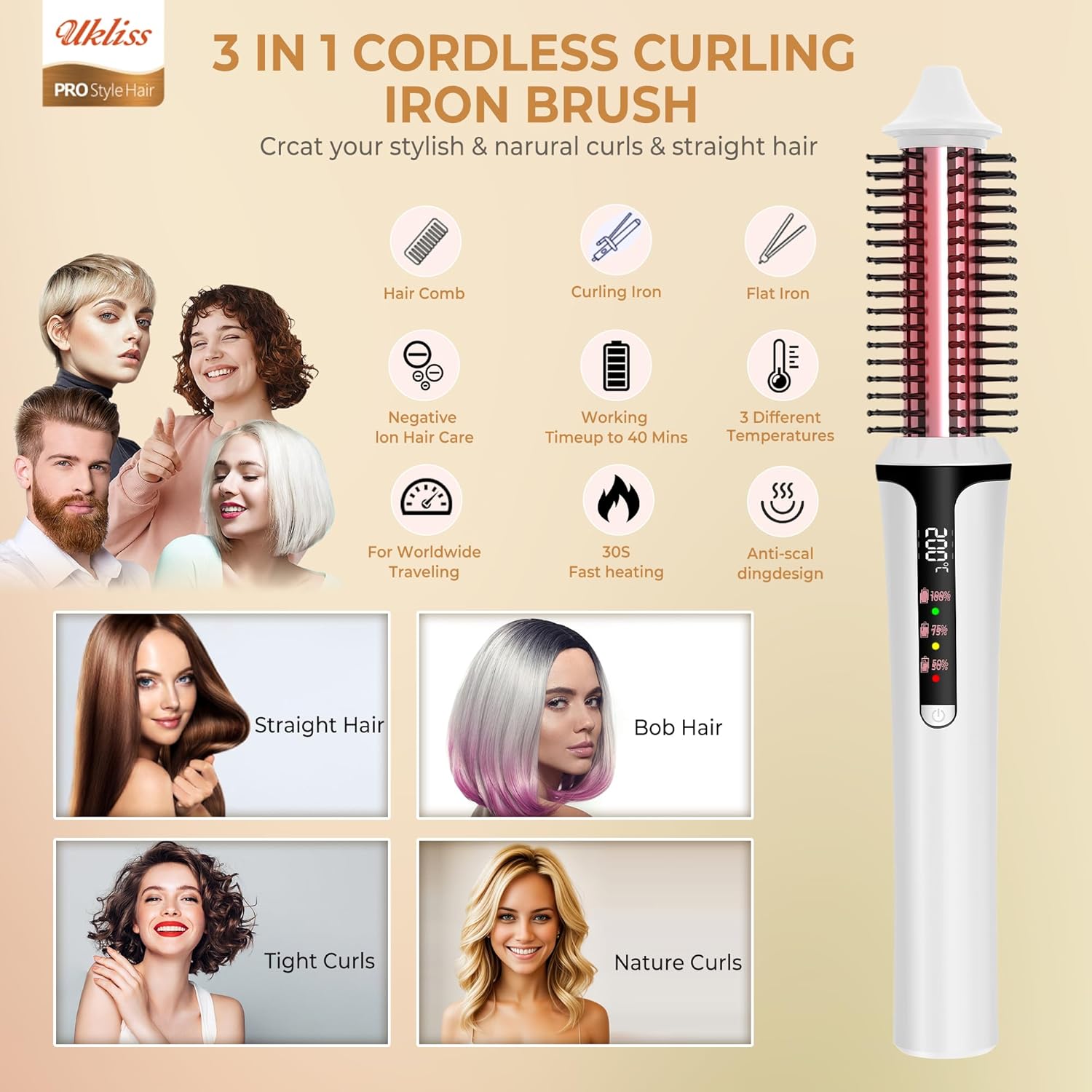 Thermal Brush Draadloze 3-in-1, warmteborstel, thermoborstel 22 mm, UKLISS Hot Brush ronde borstel 160 – 204 °C, compacte krultang produceert wortelvolume en losse krullen, dubbele spanning, geschikt