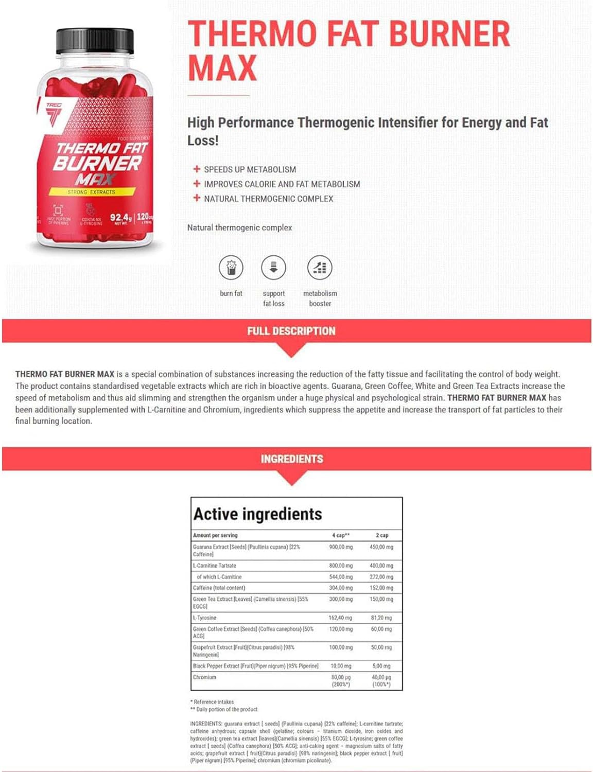 THERMO FAT BURNER MAX bevat gestandaardiseerde plantaardige extracten van Guarana, groene koffie, witte en groene thee die rijk zijn aan bioactieve stoffen. THERMO FAT BURNER MAX is aanvullend aangevuld met L-carnitine en chroom – mineraal dat bijdraagt tot een normaal metabolisme van macronutriënten en tot het behoud van normale bloedglucosespiegels.