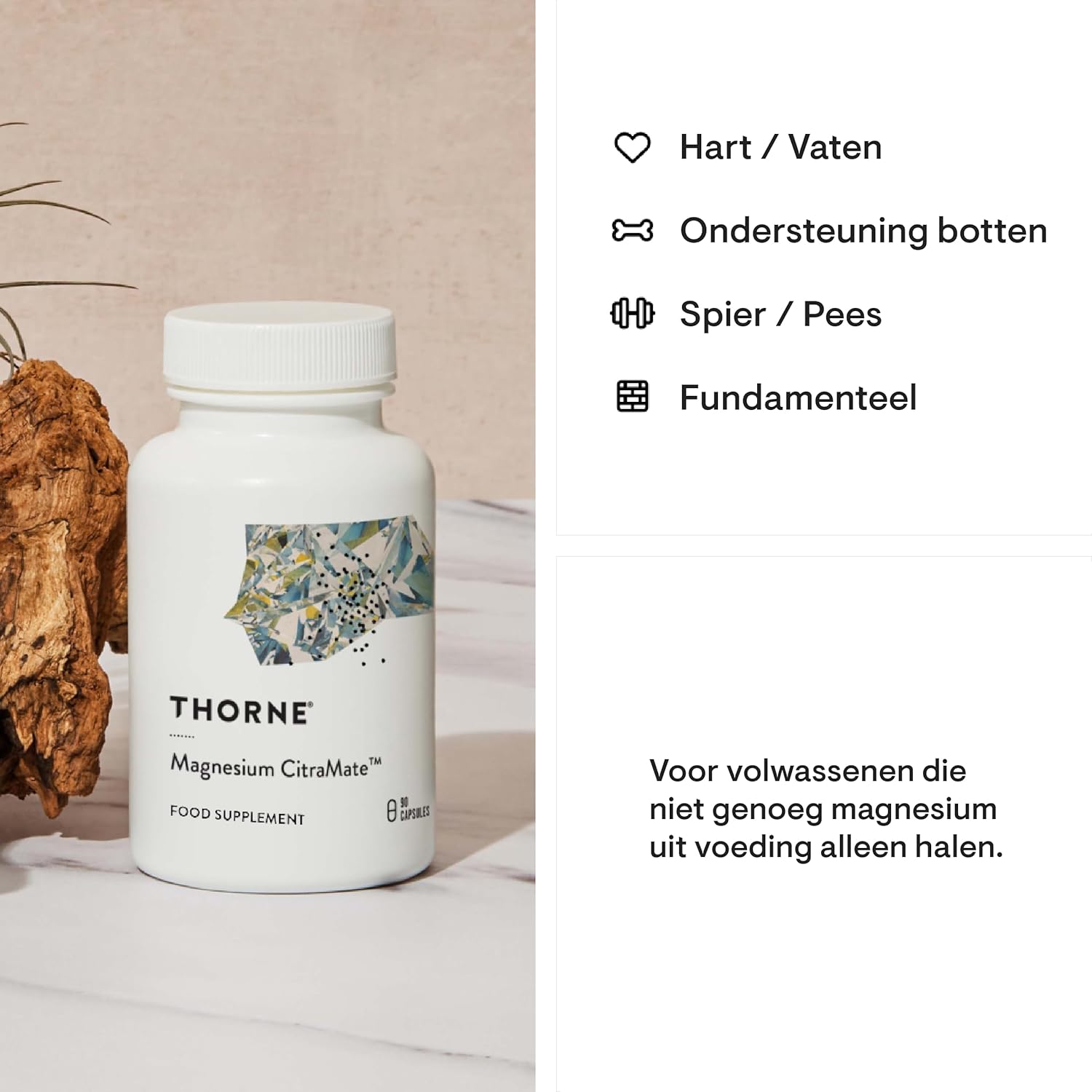 Een goed geabsorbeerde vorm van magnesium. Sinds 1984 stelt Thorne de norm voor de uitzonderlijke formulering en kwaliteitsproductie van voedingssupplementen. Thorne levert hoogwaardige, op wetenschap gebaseerde producten, een platform voor gezondheidsdiagnostiek en de nieuwste medische opleidingen. Met meer dan 350 producten is Thorne het meest verkochte merk door 30- tot 40-jarige artsen. Thorne is toegewijd aan het verbeteren van de gezondheid van onze gemeenschap en het vergroten van de kennis over nutritionele gezondheid en welzijn. Sinds 2012 heeft Thorne samengewerkt met onderwijsinstellingen en lokale goede doelen om meer dan 1 miljoen aan producten en winst te doneren. Thorne-producten bevatten geen onnodige bindmiddelen, coatings, desintegratiemiddelen, vulstoffen of smeermiddelen (waaronder magnesiumstearaat) die de absorptie kunnen belemmeren. Thorne houdt zich aan de huidige Good Manufacturing Practices (cGMP’s) van de FDA en heeft het hoogste aantal NSF Certified for Sport producten die testen op meer dan 200 verboden stoffen voor topsportwedstrijden.