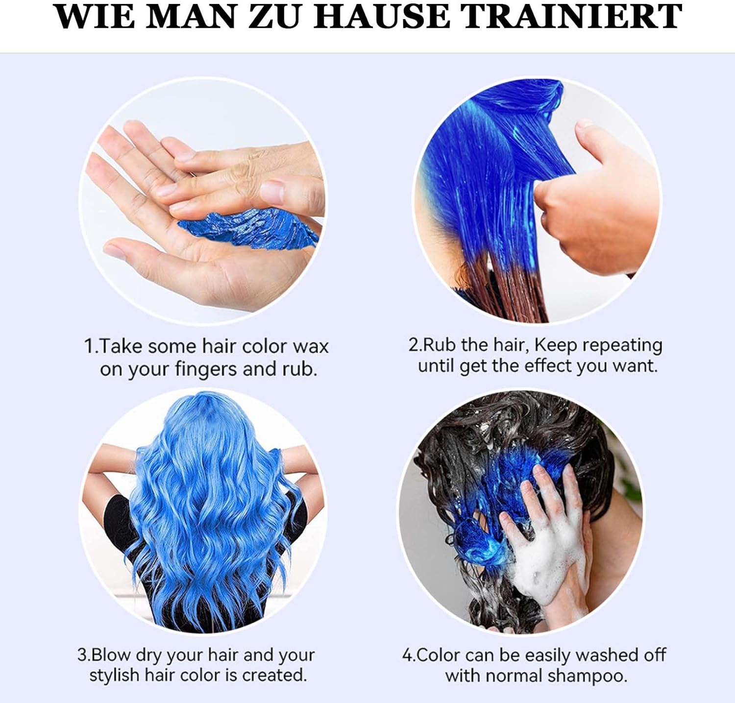 Wasbaar en veilig: in vergelijking met traditioneel bleken en verven van het haar beschadigt de haarwax je haar niet, is oplosbaar in water, milieuvriendelijk en comfortabel en kan gemakkelijk met water en shampoo worden afgewassen. Omdat deze haarkleur niet permanent is, kun je de nieuwe look voor altijd behouden.