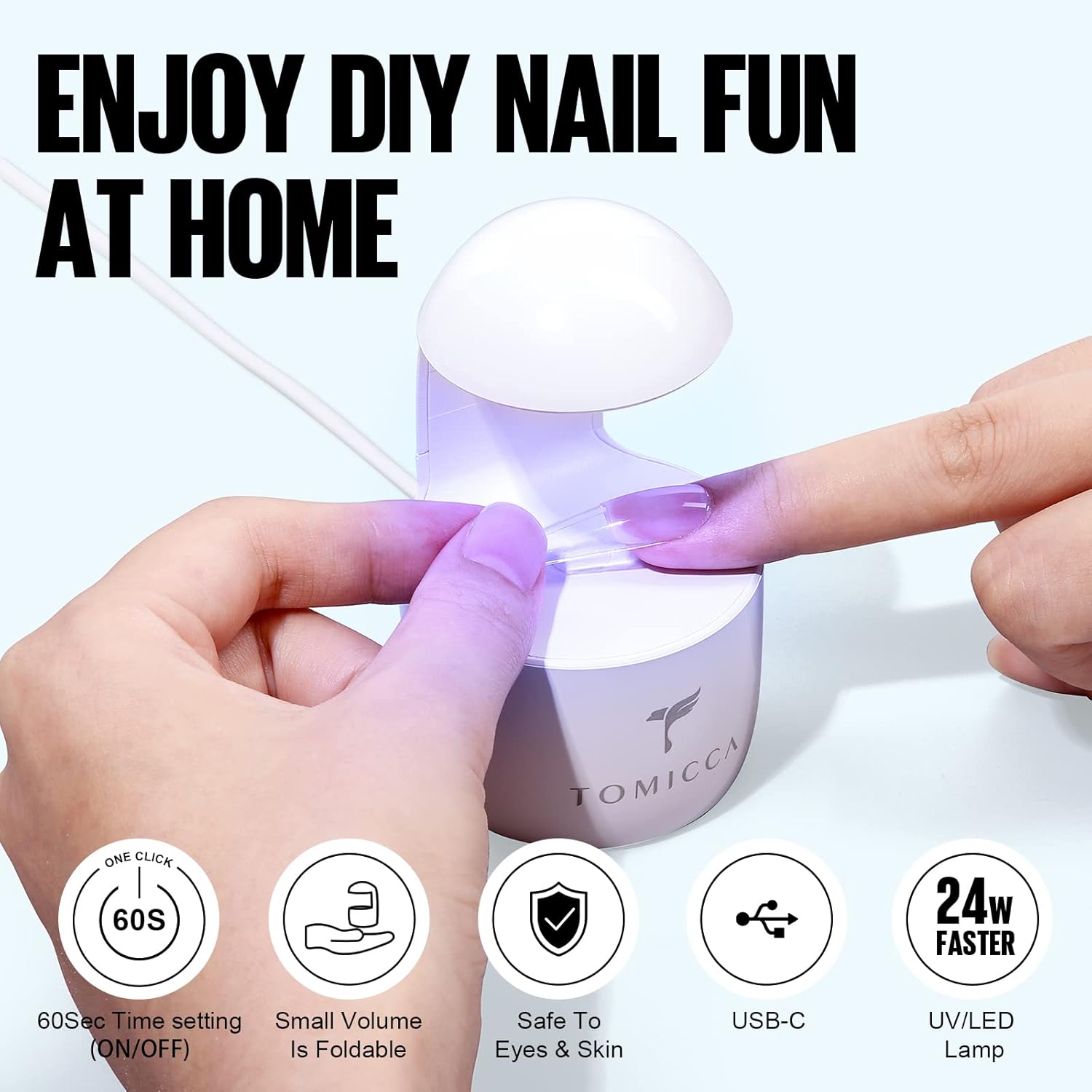 TOMICCA mini-nagellamp is compact en draagbaar, hij kan gemakkelijk in je tas worden gestopt, waardoor hij gemakkelijk mee te nemen is als je uitgaat of reist, en je kunt je nail art overal en altijd maken. De mini U V / LED-lichtnagellamp is een ontwerp met één vinger, of het nu de lange of korte nagel is, hij kan gelijkmatig worden uitgehard