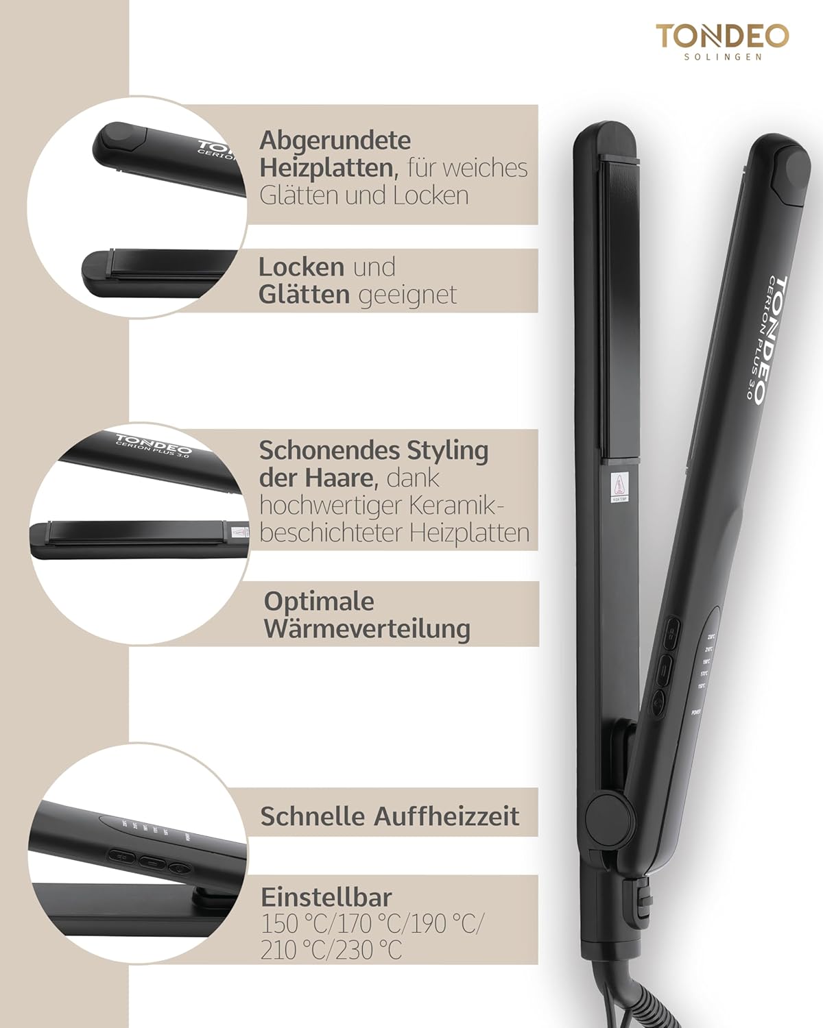 TONDEO Straightener CERION PLUS 3.0 | Haarstyler met afgeronde keramische platen | zacht steilen en krullen van haar