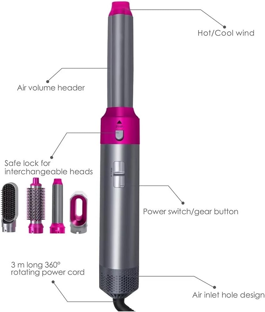 Haardroger met hoge snelheid, 5-in-1, elektrische borstelset voor professionele styling. Ben je klaar om je styling-routine in een salonervaring direct thuis te veranderen? Met de 5-in-1 haardroger en de elektrische borstelset zal je haar er in enkele minuten altijd perfect uitzien. Deze revolutionaire tool combineert drogen, stylen en haarverzorging in één apparaat en is daardoor de ideale metgezel om ongelooflijke looks met gemak te creëren. Ontdek meer en laat je inspireren door een gereedschap dat in je beautyset niet mag ontbreken. Belangrijkste kenmerken: multifunctionele 5-in-1 set: bevat vijf verwisselbare accessoires voor het drogen, gladmaken, krullen, volume en masseren van de hoofdhuid. Negatieve ionen-technologie: gaat kroezen en statisch tegen en maakt het haar zacht, zijdeachtig en glanzend. Instelbare warmteregeling: drie temperatuurinstellingen voor aanpassing aan elk haartype en seizoen. Licht en handig: ergonomisch ontwerp dat vermoeidheid van de pols vermindert en zorgt voor eenvoudig gebruik waar je ook bent. Geschikt voor elke gelegenheid: perfect voor thuisgebruik, op reis, voor speciale gelegenheden of als elegant en functioneel cadeau. Technische gegevens Prestaties: 1000W Spanning: 110/220V Frequentie: 50/60Hz Diameter van warmte meleiters: 3. 1 mm of meer Productmateriaal: ABSKABKellengte: 1,8 meter met 3 rotatie 60° Toepasselijk haar: voor gebruik op nat en droog haar Wat is inbegrepen? 1 x hoofdhandgreep met haardrogermotor, 1 x haardrogerkop, 1 x kamkop met halve hoek, 1 x ronde kamkop, 1 x automatische zuigkam (rechts draaiend), 1 x automatische zuigkam (linksdraaiend). Veelgestelde vragen: 1. Wat maakt deze haardroger bijzonder? Dankzij de combinatie van drogen en stylen kun je met ons apparaat comfortabel thuis kapsels creëren. Technologie