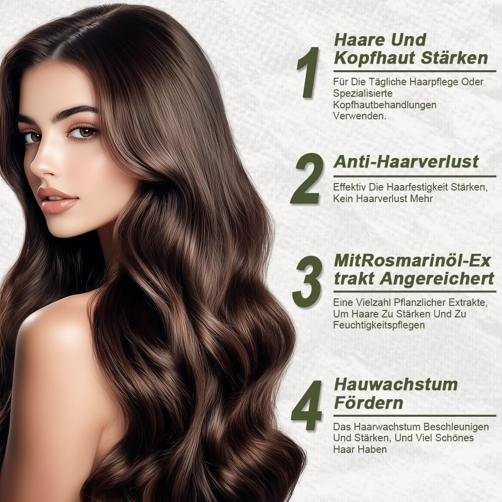Natural hair growth: Our hair oil is made from natural ingredients such as rosemary oil, argan oil and cold-pressed castor oil, which promote blood circulation and can be proven to accelerate hair growth. It does not contain harmful chemicals and is therefore suitable for everyday use.