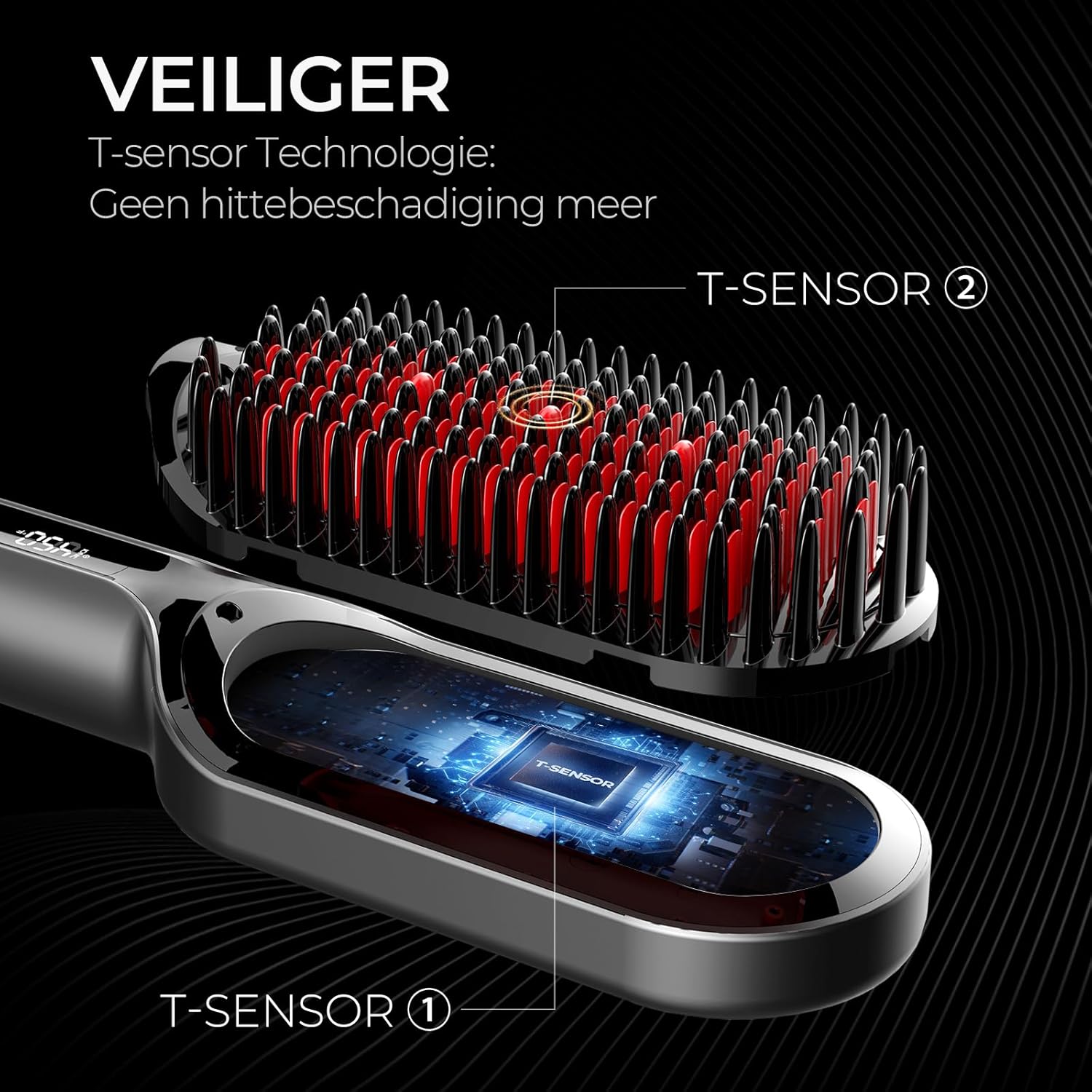 [Veiligheids- en comfortkenmerken]: De stijltang biedt een ergonomische handgreep voor comfortabel en veilig gebruik, verborgen knoppen om onbedoelde aanrakingen te voorkomen en koele borstelharen om de hoofdhuid en handen tegen brandwonden te beschermen. Het gepatenteerde borstelontwerp zorgt voor een gelijkmatige warmteverdeling. Vergeleken met traditionele stijltangen veroorzaakt het minder hitteschade.