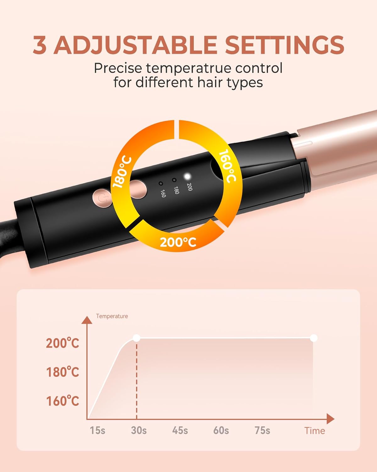 【3 warmtestanden en een gebruiksduur van meer dan 24 uur】 Het LED-display van de mini-krultang geeft 3 temperaturen weer. De temperatuur van de mini-krultang voor kort en halflang haar kan worden ingesteld tussen 160 °C en 200 °C, afhankelijk van het haartype. 160 °C is geschikt voor broos/beschadigd haar, 180 °C voor normaal haar en 200 °C voor dik/sterk haar. Of je nu dun, fijn of dik, grof haar hebt, met de krultang heb je volledige controle over je stylingresultaten