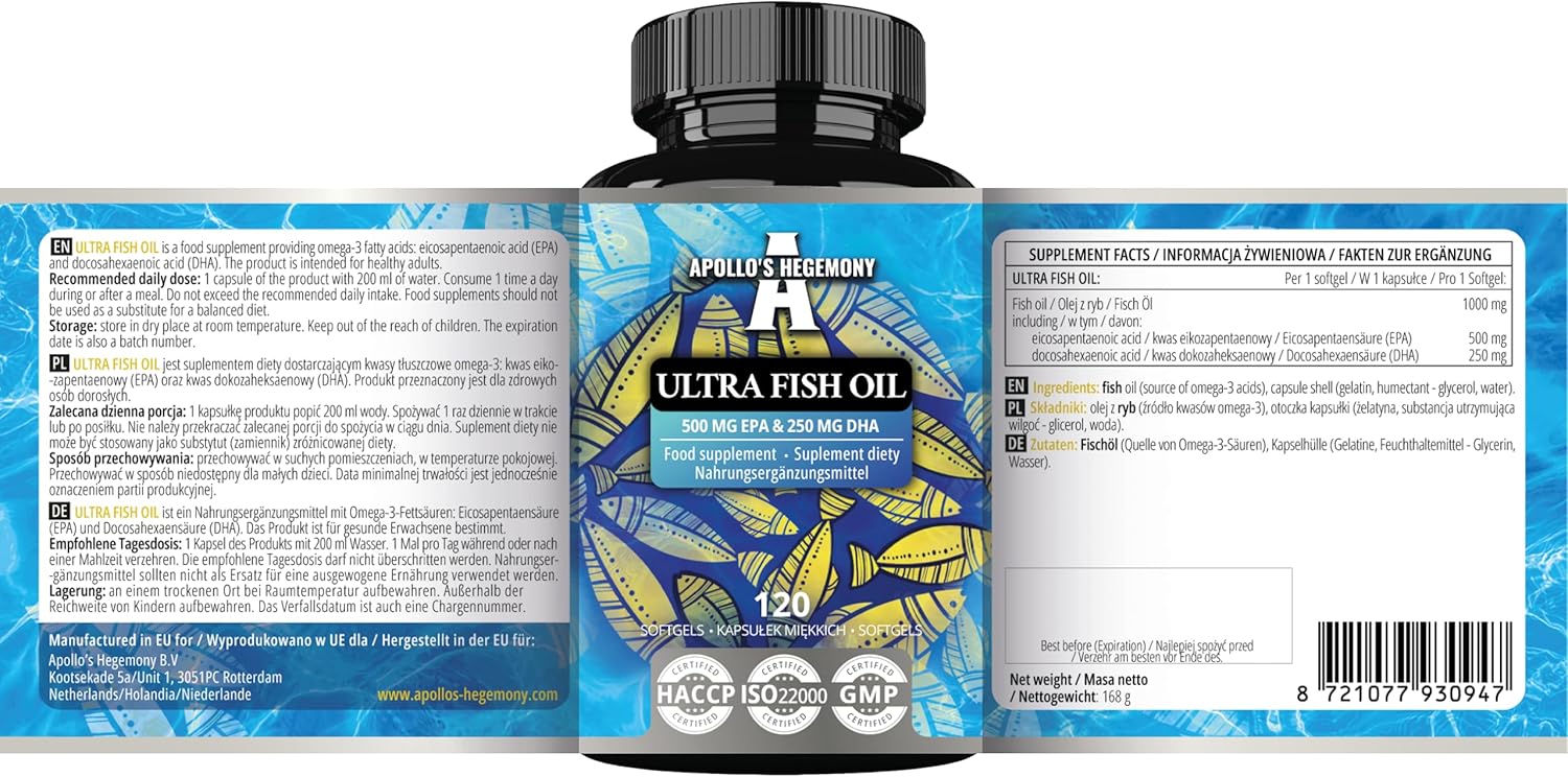 Ultra Visolie 1000mg, 120 Softgel Capsules, Hoge Dosis Omega 3 met 500mg EPA en 250mg DHA, 4 maanden voorraad, Vetzuren (EFA’s) – Ondersteunt de gezondheid van hart en hersenen – Apollo’s Hegemony