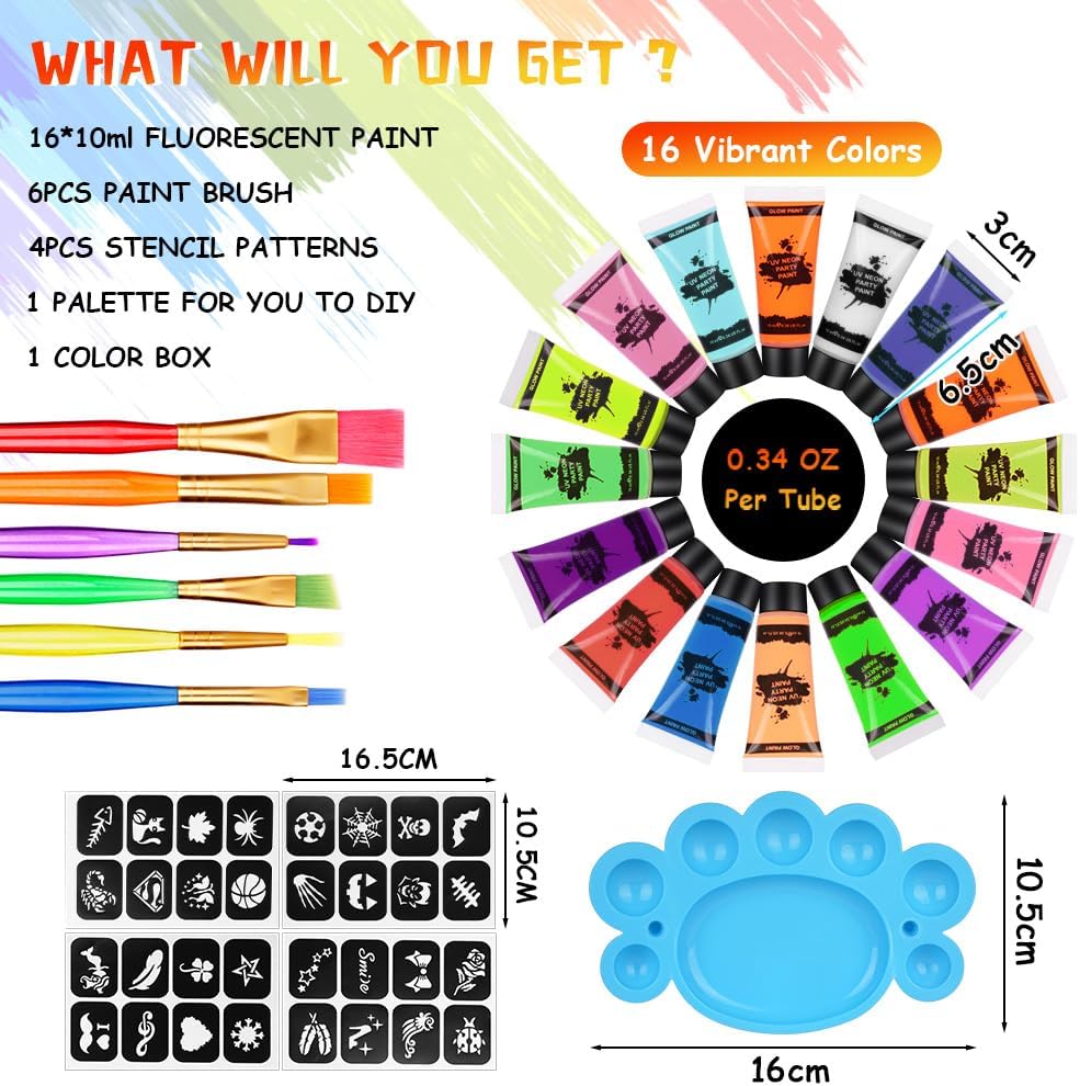 UV Glow Face Body Paint Set, 16 Kleuren UV Blacklight Neon Fluorescent Face Paint, Niet-giftige Glow in Dark Face Body Painting met Palet & penselen, Make-up Kunstverf voor Volwassenen Kinderfeest