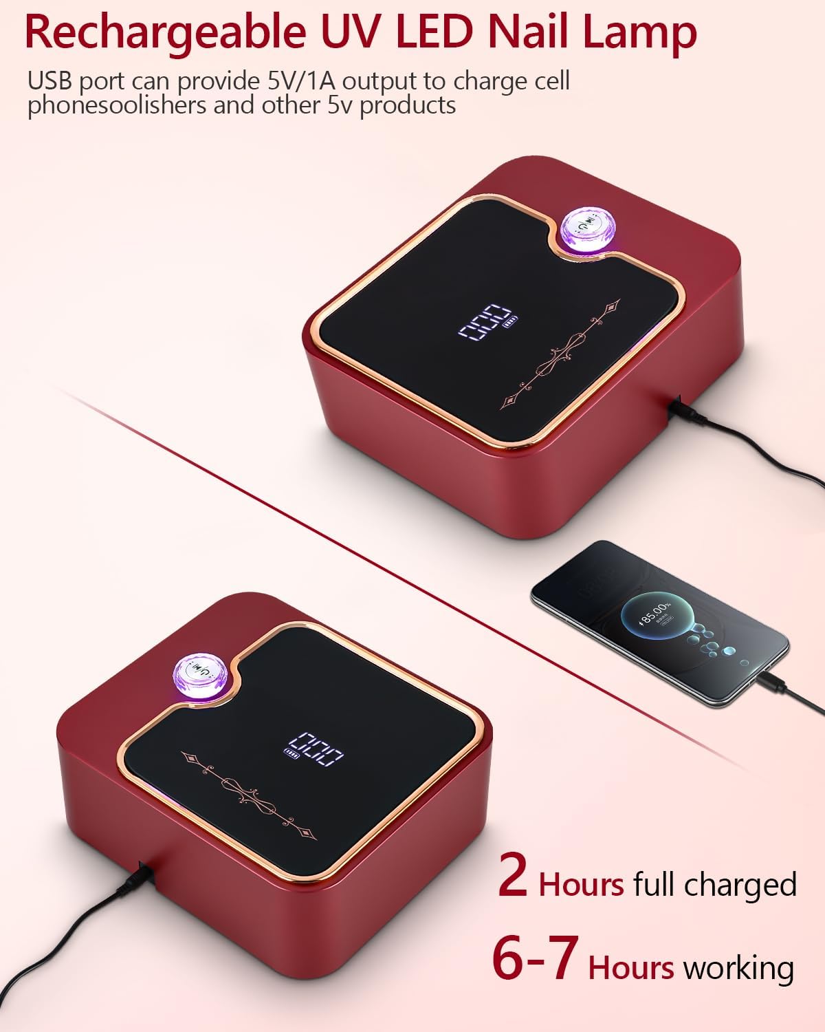 Bellissima lampada UV LED per unghie che arriva ben confezionata all’interno della sua scatola che ci dice cosa ci offre tra i tre modelli stampati e incluso c’è un piccolo manuale e l’alimentatore con presa a due poli.Si accende e si spegne tramite il pulsante posto proprio accanto al display, che funge anche da manovella; ha un’ottima potenza, parliamo infatti di 120W, possiede un ampio display digitale lcd che ci indica il timer e il residuo della batteria perché la vera particolarità di questa è che ovviamente il funzionamento è elettrico ma non solo, infatti possiede una grande batteria ricaricabile per poterla utilizzare ovunque o senza avere fastidiosi fili in giro. I secondi si regolano tramite la rotella che ha il pulsante di accensione. La ricarica è abbastanza veloce, ma ho notato che questo avviene solo a dispositivo acceso.Catalizza le unghie molto molto bene, sia semi permanente, gel, tip etc… Comoda, leggera da trasportare, efficiente nei lavori già ai 30 secondi. Il design poi si presenta estremamente elegante, con una decorazione a tema nobiliare sul display e la manopola quasi diamantata.Per ora mi sento di consigliarla!