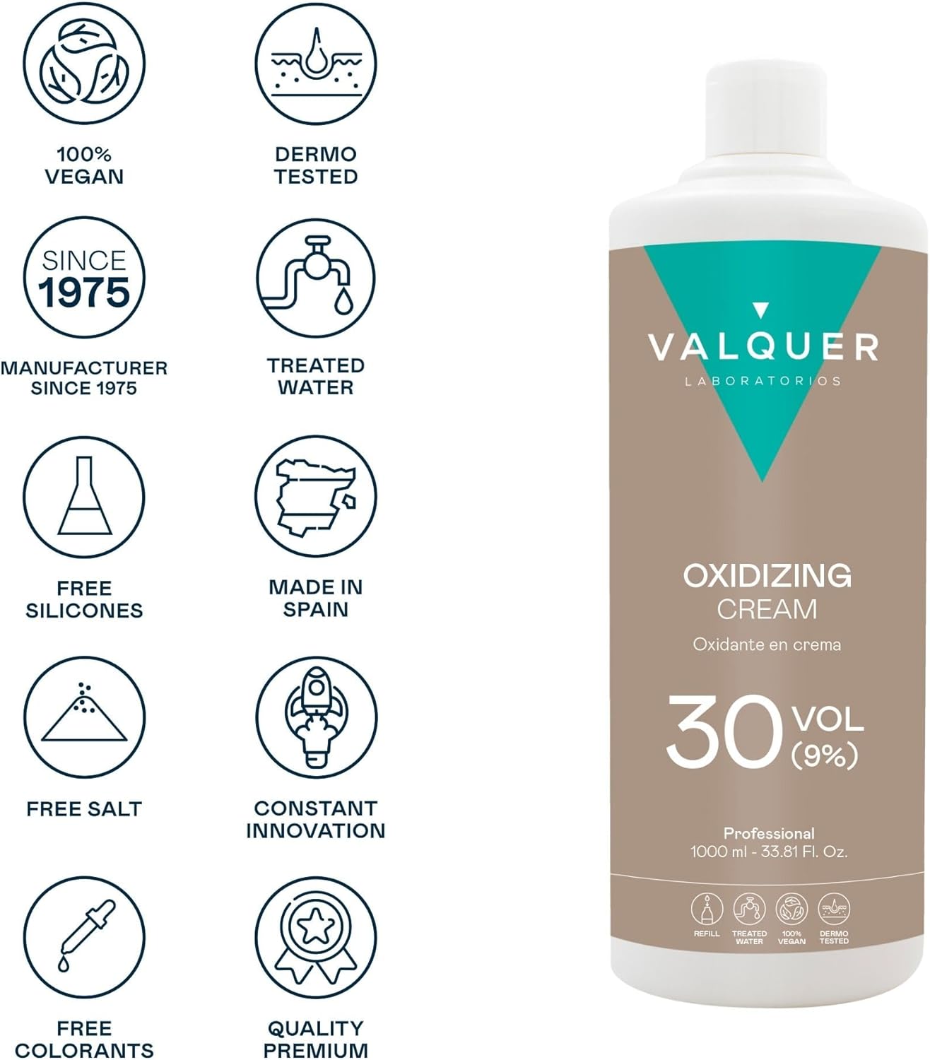 Valquer Oxidizing Cream. Stabilized Oxygen Cream 40 Volumes 12%, Oxidant for permanent hair coloring and discoloration. Vegan formula with natural ingredients. 1 l.