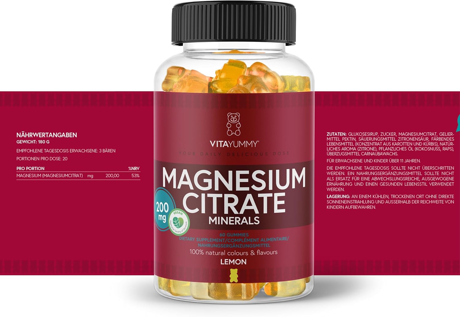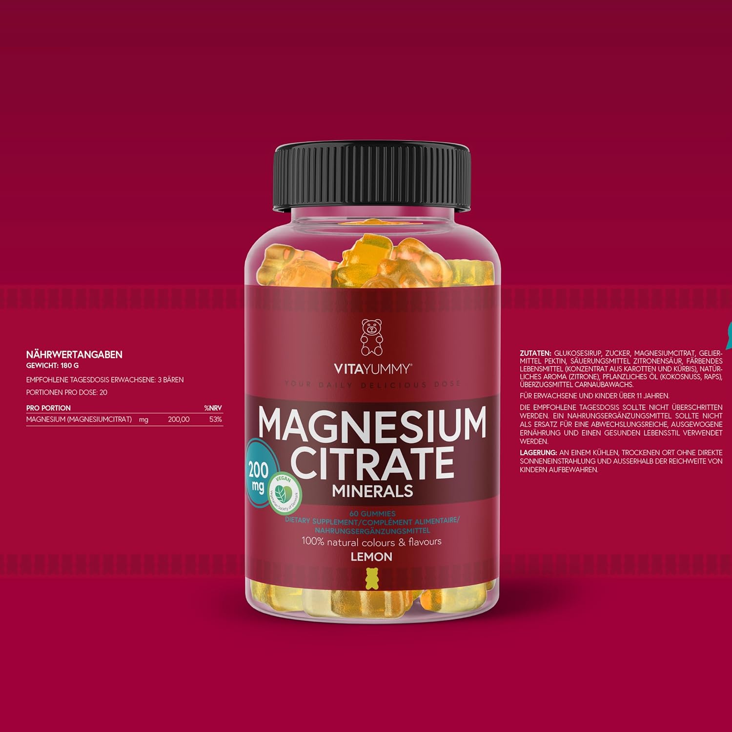 Vitayummy’s Magnesium Supplement Gums bevat 200 mg magnesiumcitraat per gummy. De aanbevolen dagelijkse dosis voor dit supplement is 3 gummies per dag voor volwassenen en kinderen ouder dan 11 jaar.