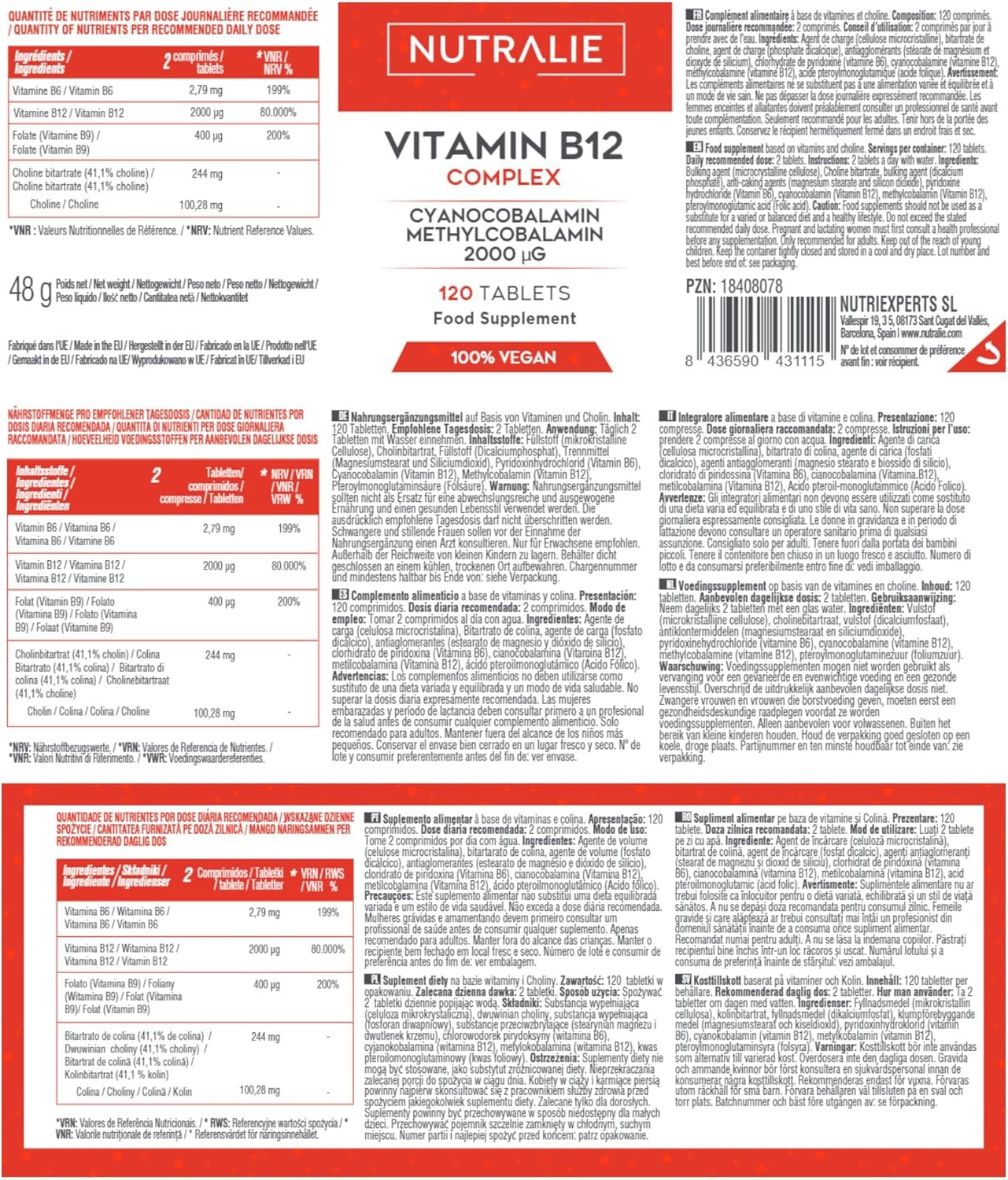 Veganistische Vitamine B12 2000mcg Cyanocobalamine en Methylcobalamine | Hoge Potentie | Minder Vermoeidheid en Rode Bloedcelvorming Vitaminen B9 B6 | 120 Nutralie Tabletten