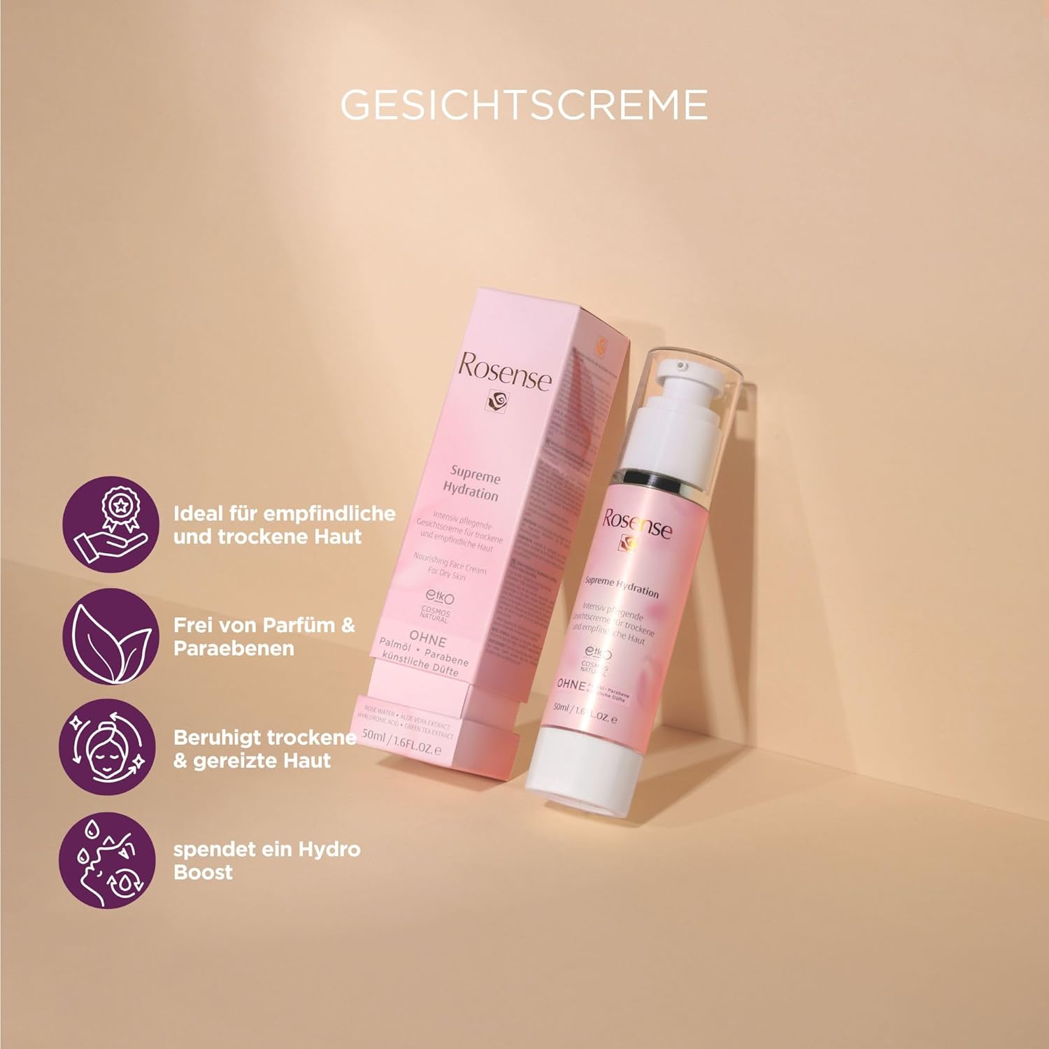 Gezichtscrème: de Supreme voedende gezichtscrème is perfect ontworpen voor de droge en gevoelige huid. Het bevat oliën, vitaminen, rozenwater, aloë vera en hyaluronzuur om de huid intensief te voeden, te beschermen en van vocht te voorzien. Het hyaluronzuur draagt bij aan de versteviging en helpt de gevoelige huid te kalmeren.