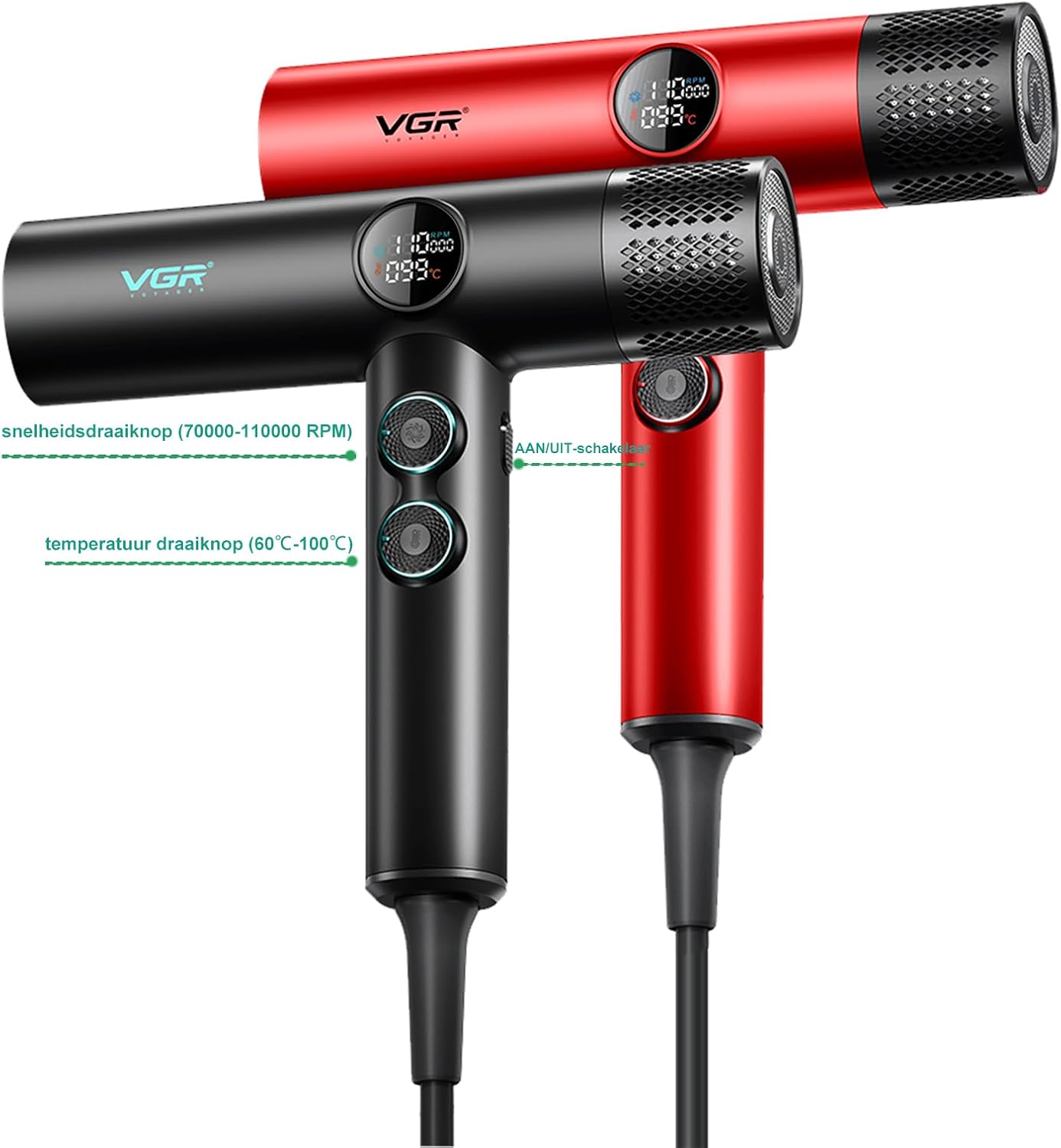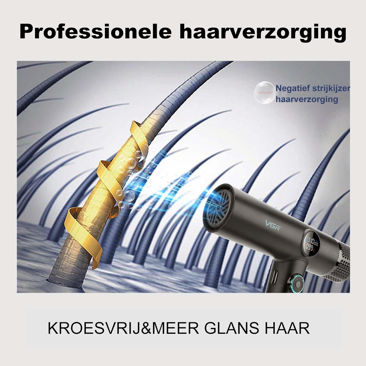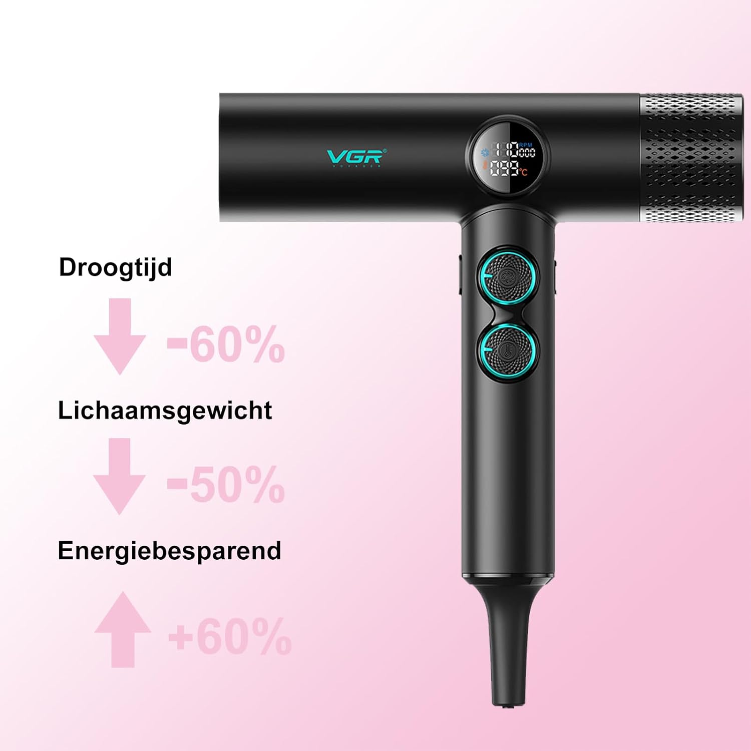 VGR 401 Negatief Ionische Haardroger, Professionele BLDC Motor Föhn voor Snel Drogen, LED Display Low Noise Thermo en RPM-Control Haardroger, Reizen met Magnetische 1 Diffuser & 2 Nozzle, Zwart