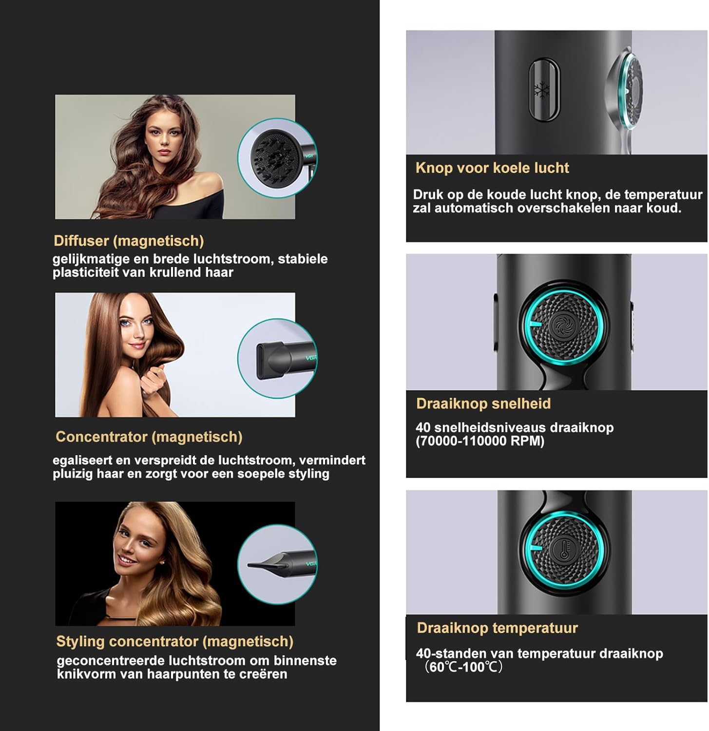 Precieze temperatuur- en snelheidsinstellingen: Met 40 aanpasbare warmte-opties (60-100°C) en 40 snelheidsaanpassingen (70000-110000 RPM), weergegeven op een slank LED-scherm, garandeert deze haardroger perfecte controle voor al je stylingbehoeften