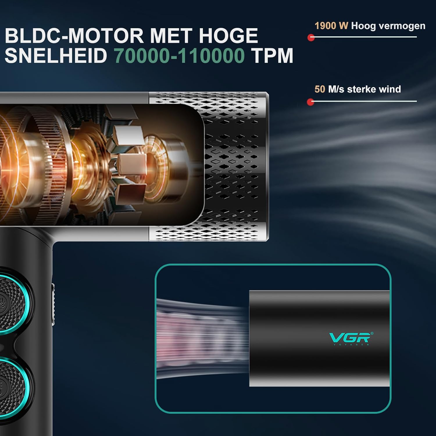 Professionele BLDC Motor voor snel drogen: Met zijn krachtige 1600-1900W borstelloze motor levert de VGR 401 haardroger een indrukwekkend sterke en stabiele luchtstroom voor ultrasnel drogen, waardoor de styling tijd wordt verkort en optimale prestaties voor elk haartype worden gegarandeerd