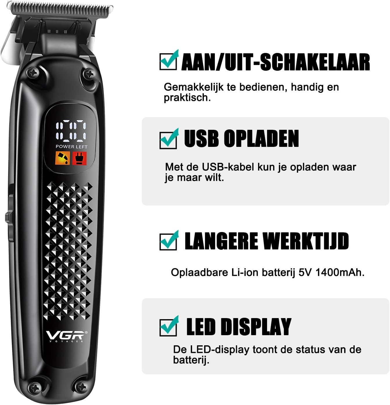 Batterij met hoge capaciteit: de tondeuse beschikt over een oplaadbare lithium-ionbatterij van 1400 mAh, die tot 180 minuten gebruik biedt na 2 uur opladen. U kunt de oplaadkabel aansluiten of de kapper draadloos gebruiken nadat u deze tot een bepaald niveau heeft opgeladen