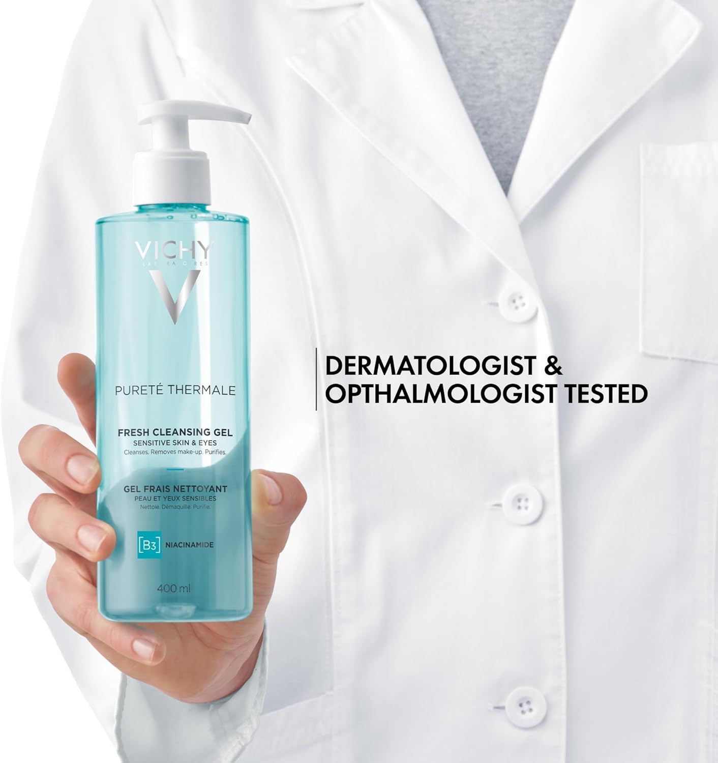 Vichy Pureté Thermische verfrissende reinigingsgel, langdurige hydratatie, make-up remover en gezichtsreiniger, voor alle huidtypes, met glycerine en vulkaanwater, 400 ml