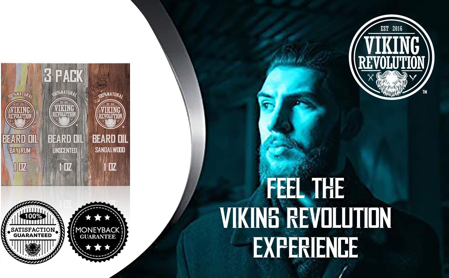 Viking Revolution Beard Oil for Men 3 Pack – Natural Mens Beard Oil Variety Set 2 – Sandalwood, Unscented and Bay Rum Scents – Beard Conditioning and Moisturizing for a Healthy Beard (3 Pack, 1oz)