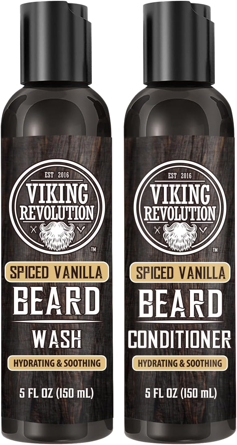 Viking Revolution Beard Wash and Beard Conditioner for Men with Argan Oil and Jojoba Oil – Beard Softener and Strengthener Beard Care Beard Shampoo and Conditioner with Beard Oil (5oz, Spiced Vanilla)