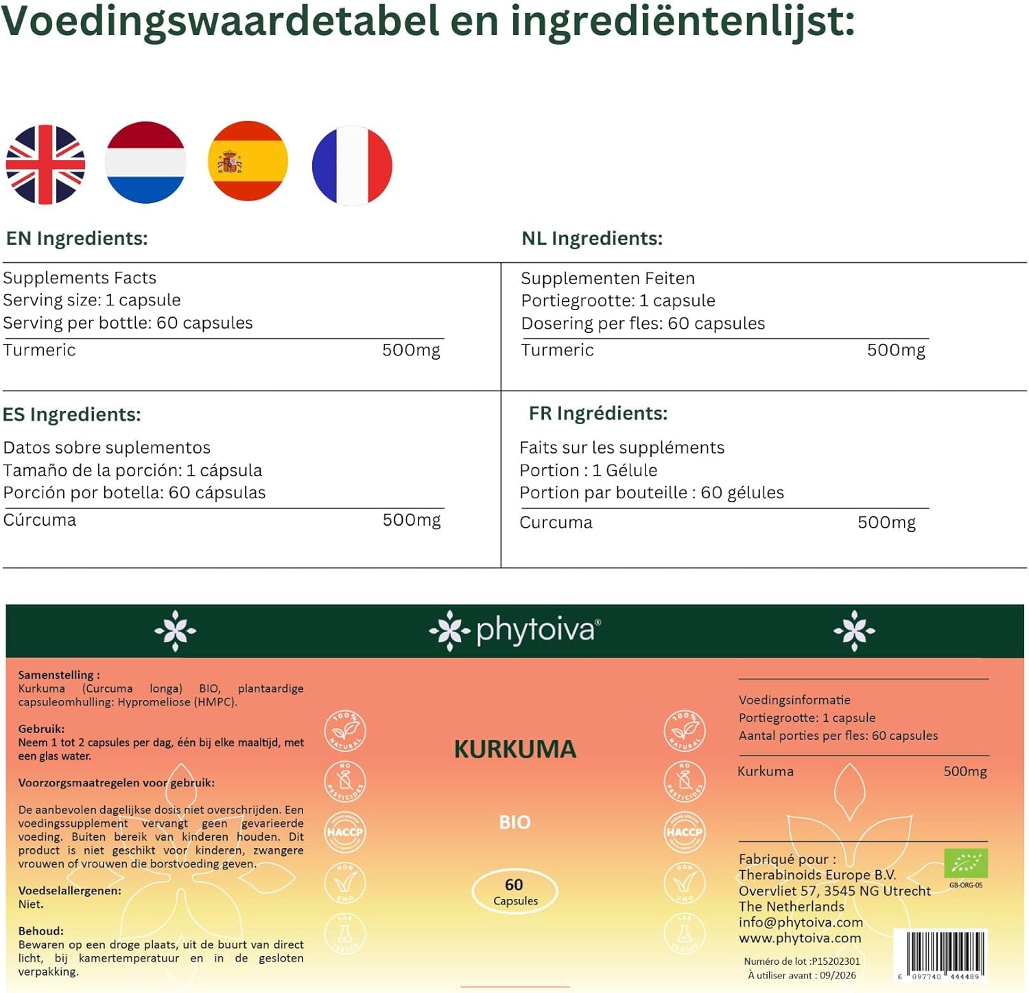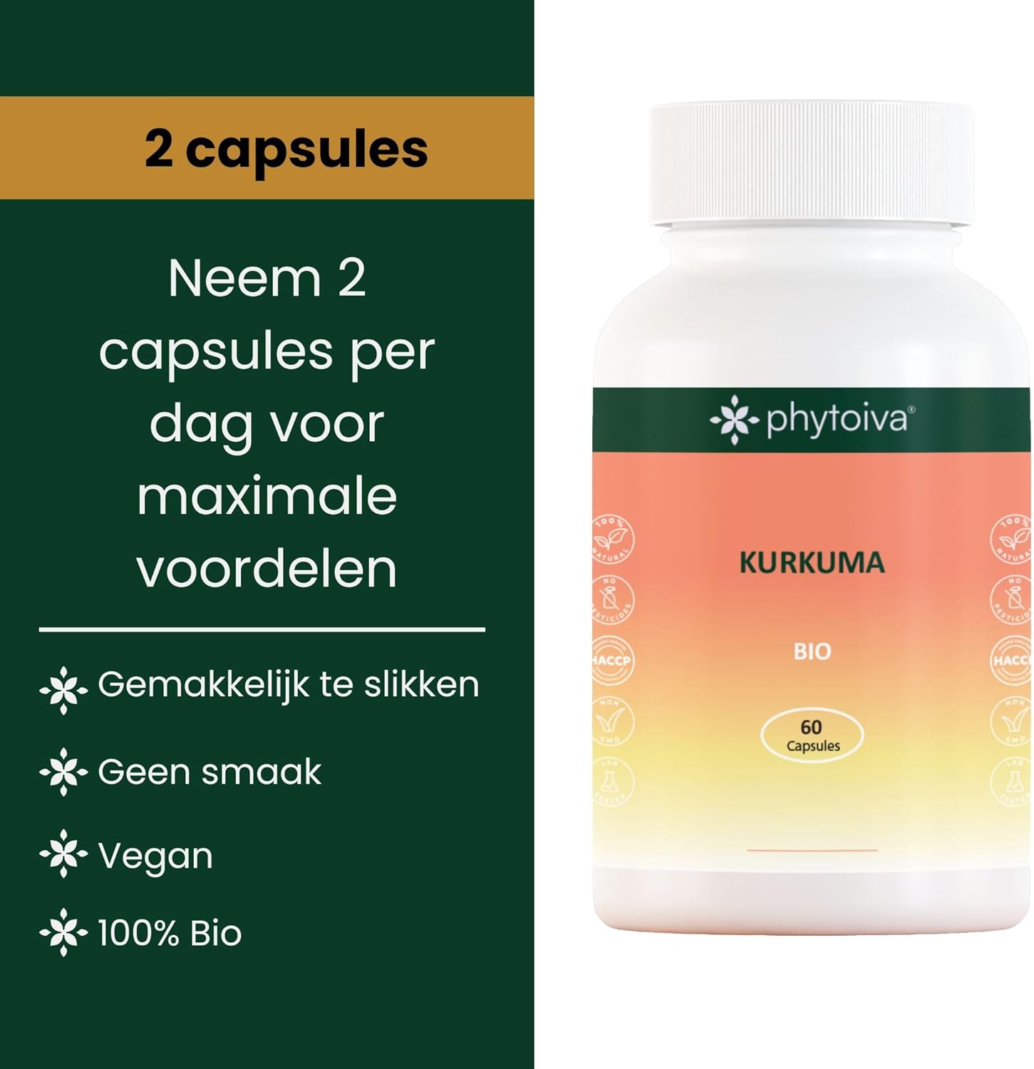 Voor wie is Phytoiva Kurkuma BIO Capsules bedoeld? Biologisch kurkumapoeder wordt veel sneller opgenomen, wat helpt bij het verlichten van gewrichtspijn en bijdraagt aan de algehele gezondheid. Onze biologische kurkumacapsules zijn 100% natuurlijk, veganistisch en geschikt voor elk dieet.