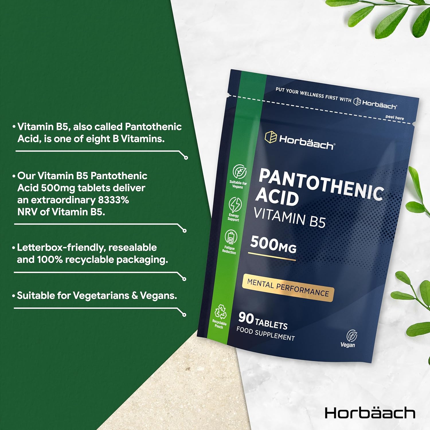 Het zeer geconcentreerde pantotheenzuur van Horbaach is speciaal ontwikkeld voor uw dagelijkse wellnessroutine. Elke portie bevat tot 500 mg pantotheenzuur (vitamine B5) in een gemakkelijk te slikken tablet. Neem eenvoudig één (1) tablet per dag met een drankje – op het door u gewenste tijdstip.