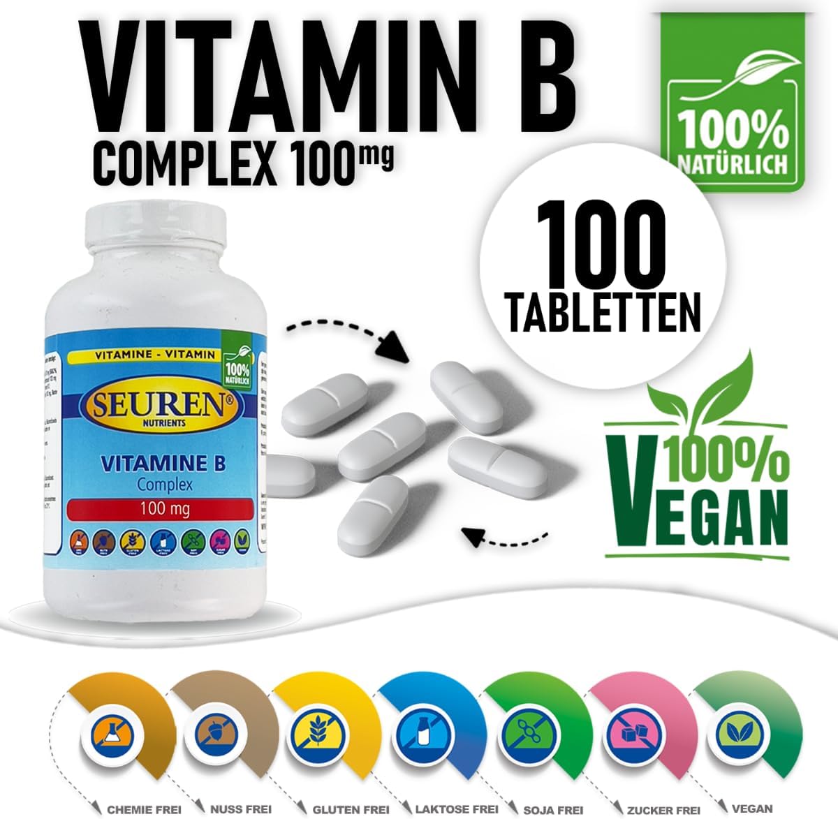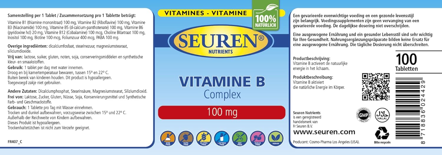 Vitamine B-complex 100 tabletten | hoge dosis B-complex | Glutenvrij | Lactosevrij | Suikervrij 100% natuurlijk
