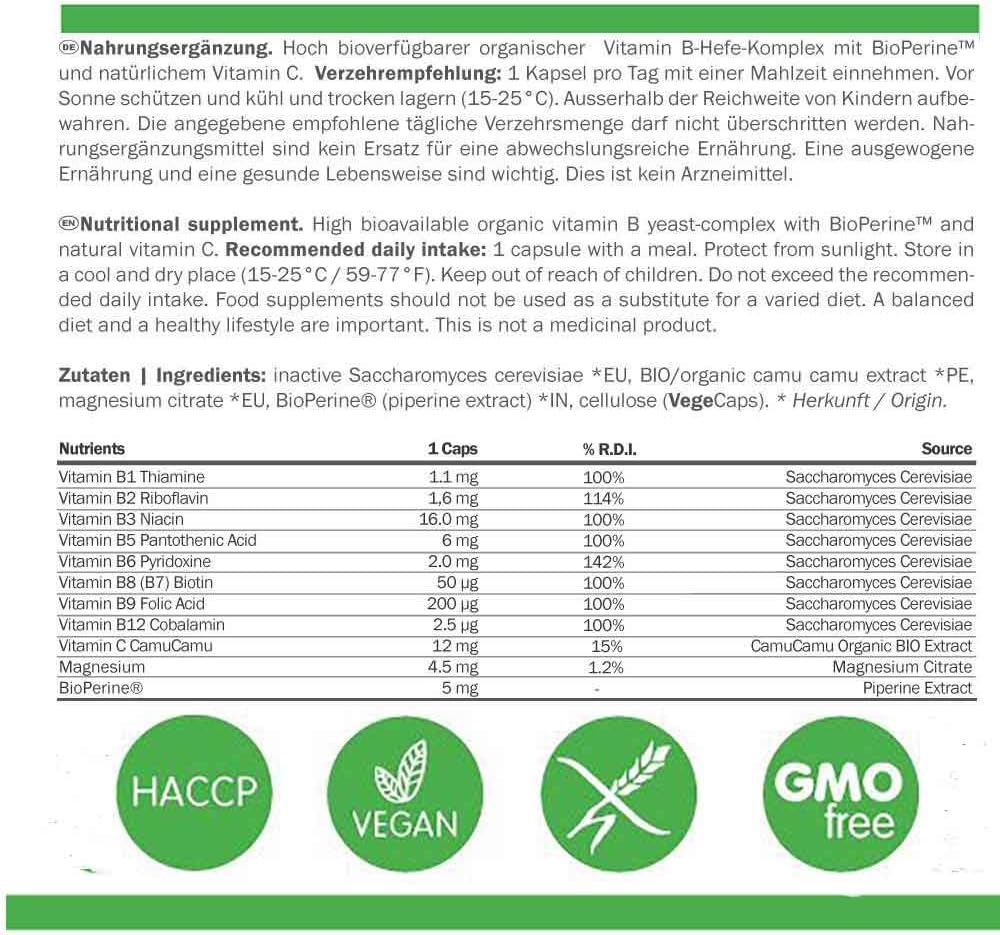 Vitamine B Complex. Nieuw recept met natuurlijke vitamine C en BioPerine. Vitamine C ondersteunt in belangrijke mate de functies van de B-vitaminen. In de inactieve gist Saccharomyces cerevisiae zitten 7 vitaminen van de B-groep in organische en hoogst biobeschikbare vorm. De vitaminen in dit product zijn als orthomoleculaire voedingsconcentraten en de biologische beschikbaarheid is bijna beter dan die van vitaminen in natuurlijk voedsel. Inactieve gist Saccharomyces cerevisiae vitaminen van de B-groep in organische en hoogst biobeschikbare vorm zoals het lichaam die nodig heeft. Vitamine B-Complex met hoge absorptie en tot 251,8% betere absorptie door BioPerine. BioPerine verbetert de lichaamseigen natuurlijke thermogene activiteit en kan daarom ook een thermonutriënt worden genoemd. Vitamine B1 Thiamine 1,1 mg Vitamine B2 Riboflavine 1,60 mg Vitamine B3 Niacine 16 mg Vitamine B5 pantotheenzuur 6 mg Vitamine B6 pyridoxine 2 mg Vitamine B8 (B7) biotine 50 µg Vitamine B9 Veulenzuur 200 µg Vitamine B12 Cobalamine 2,5 µg Vitamine C CamuCamu 12 mg Magnesium 4,5 mg Bioperine 5 mg Inhoud: 70g = 90 VegeCaps à 630mg.