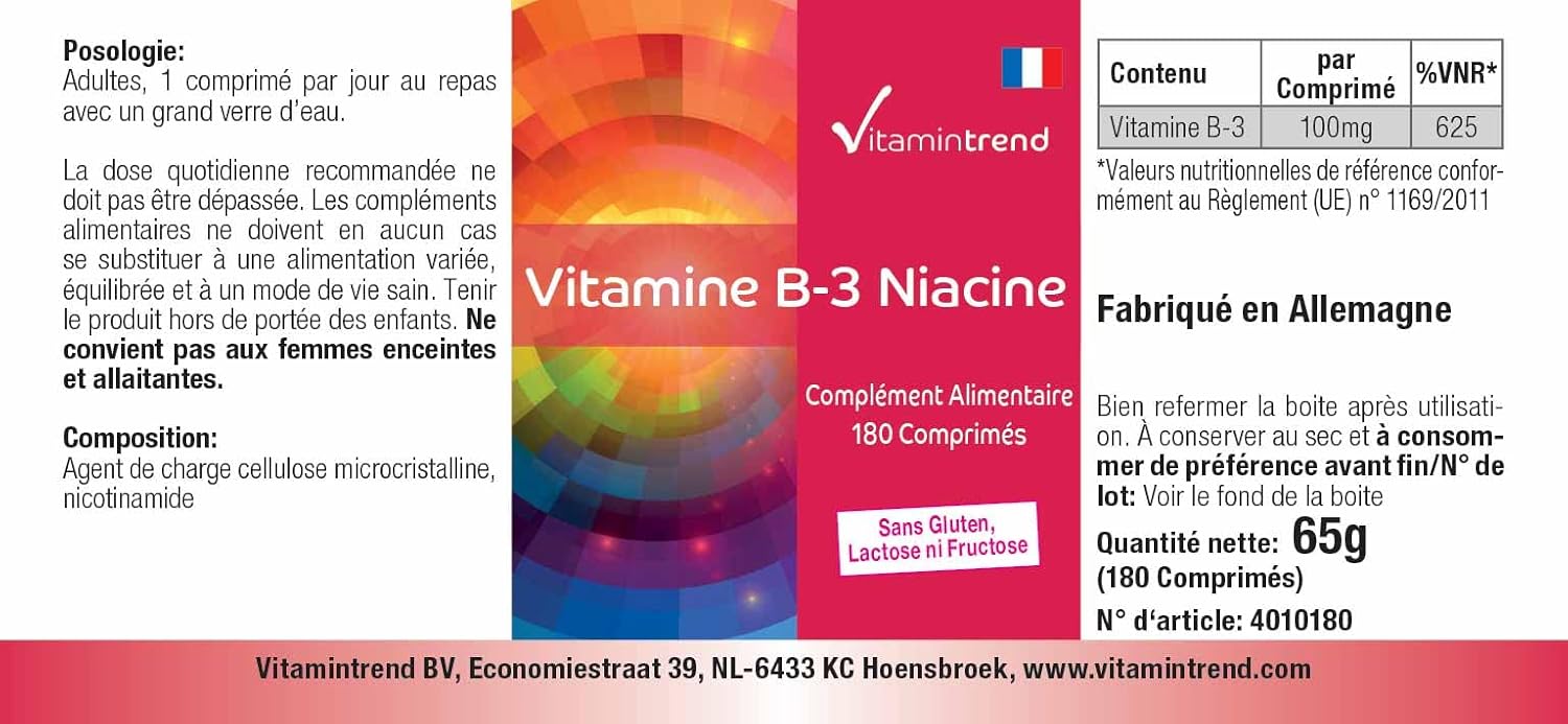 ✅ VITAMINTREND Duitse kwaliteit. Een tablet bevat: 100mg vitamine B3 – aanbevolen dagelijkse dosis: 1 tablet met veel water – hooggedoseerde werkzame stof – uitstekende prijs-kwaliteitverhouding. Draagt bij aan een normaal energiemetabolisme, een normale werking van het zenuwstelsel en een normale mentale werking.