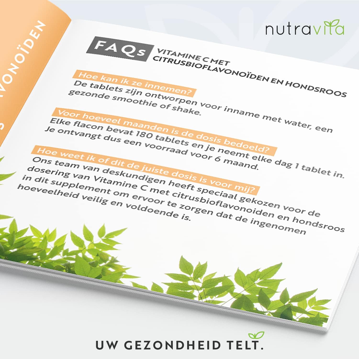 WAAROM VITAMINE C MET BIOFLAVONOÏDEN EN ROZENBOTTEL VAN NUTRIVITA? – Ons supplement bevat 1.000 mg vitamine C, verrijkt met essentiële rozenbottel- en citrusbioflavonoïden. Beide zijn natuurlijke plantpigmenten die de werking van vitamine C aanvullen.