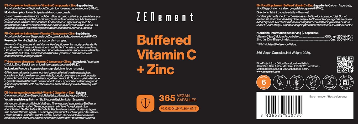Geniet van een halfjaarvoorraad met 365 veganistische capsules. Elke dagelijkse dosis (2 capsules) levert 1000 mg Gebufferde Vitamine C en 10 mg elementair Zink (als Bisglycinaat). Deze formule zorgt voor een uitstekende prijs-kwaliteitverhouding en voortdurende ondersteuning voor je gezondheid. Onze Vitamine C, glutenvrij en zonder toevoegingen, biedt een zachte combinatie voor de maag en optimale opname.