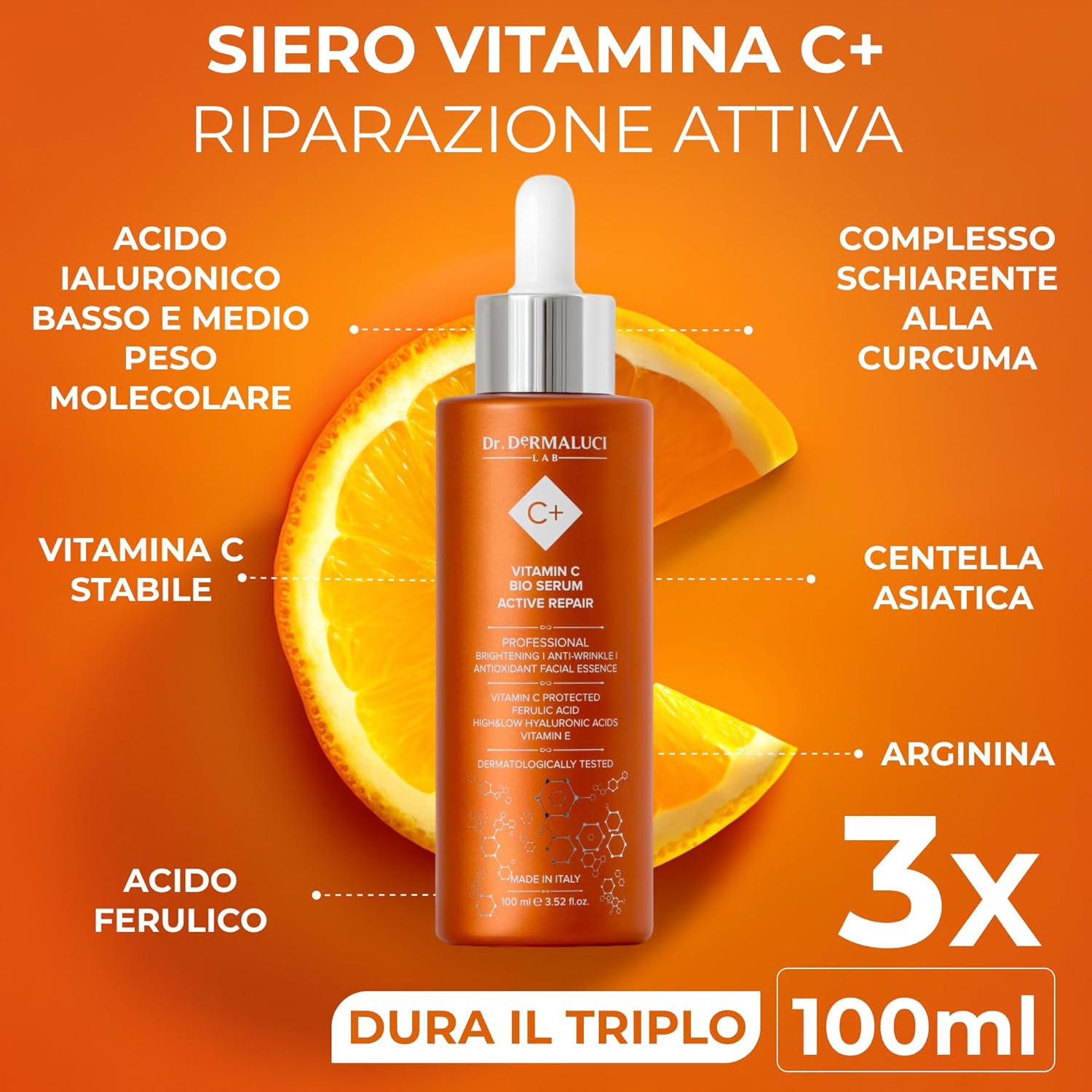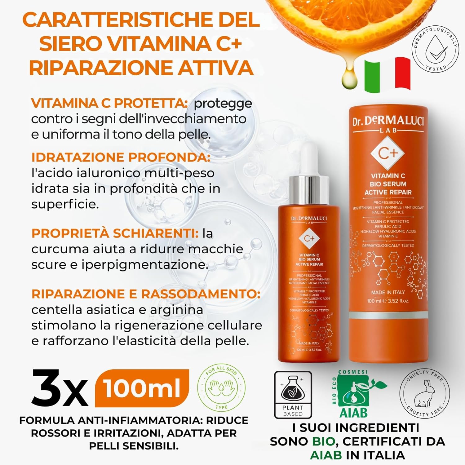 Vitamine C Gezichtsserum met Hyaluronzuur en Ferulinezuur BIO 100ml is een anti-aging product dat natuurlijke ingrediënten combineert voor een verhelderende, hydraterende en gladmakende werking. Verrijkt met een op kurkuma en centella asiatica gebaseerd verhelderend complex, helpt het pigmentvlekken en tekenen van veroudering te verminderen. Dit in Italië gemaakte serum is ideaal voor droge en rijpere huid en geeft een frissere en stralendere uitstraling. Met een lichte textuur en snelle absorptie hydrateert het intens en laat de huid zacht en glad achter. Vrij van schadelijke stoffen, een natuurlijke behandeling voor een jongere en stralende huid. Inhoud: 100 ml.