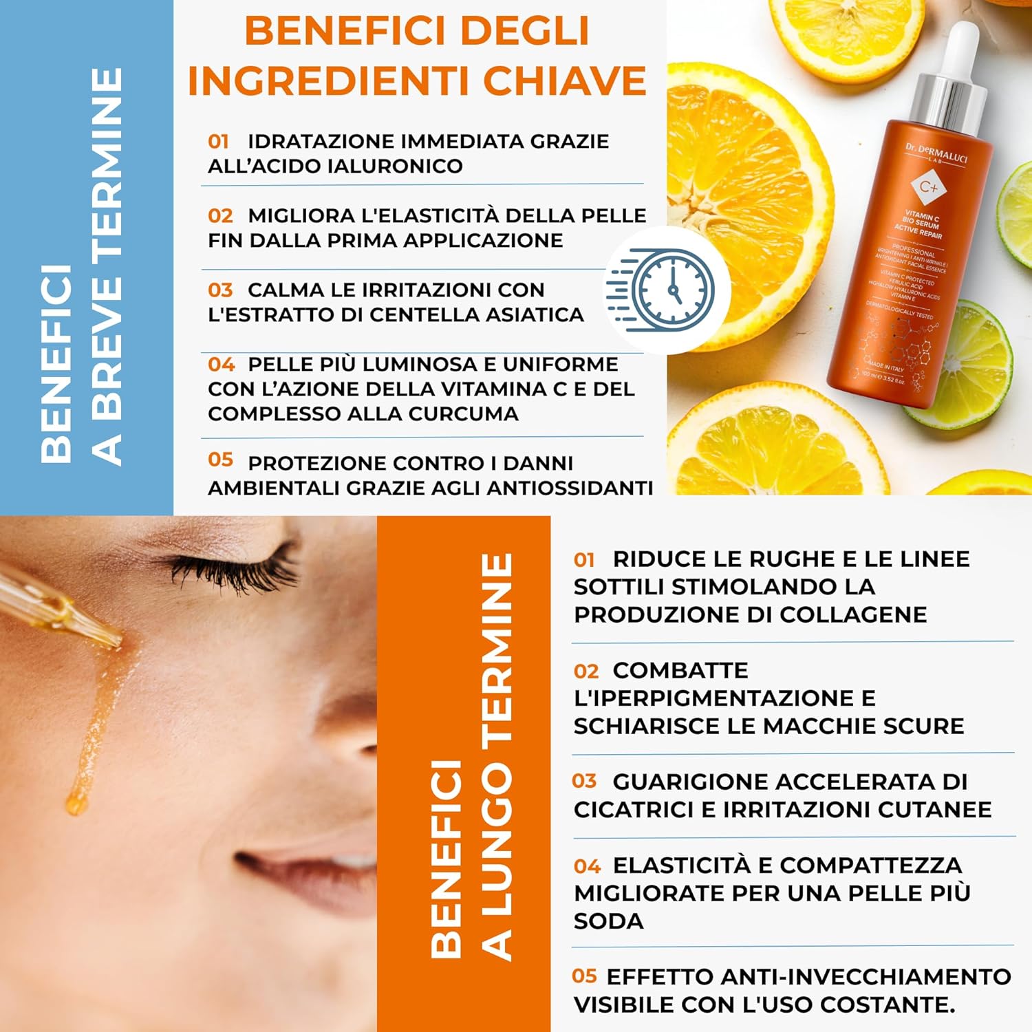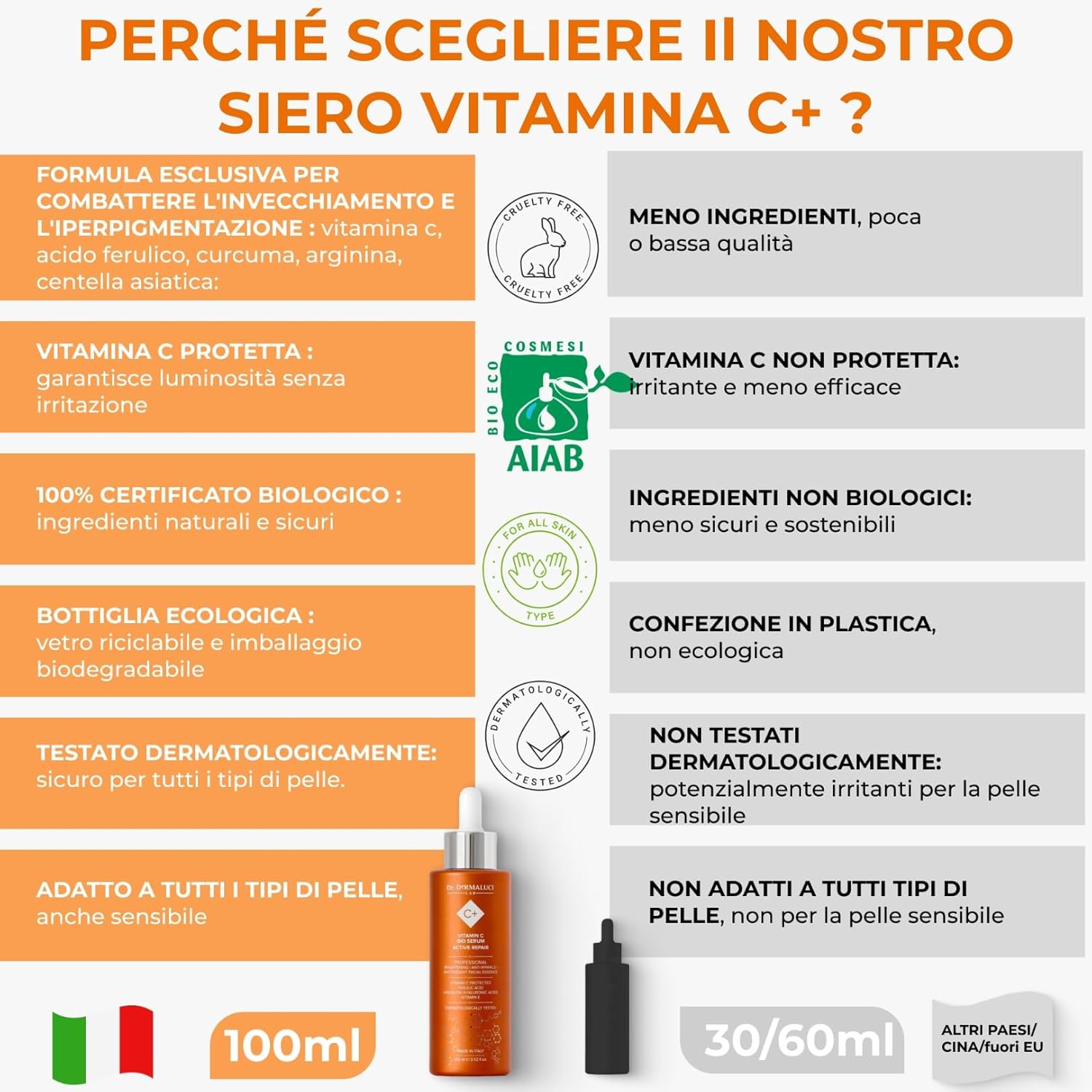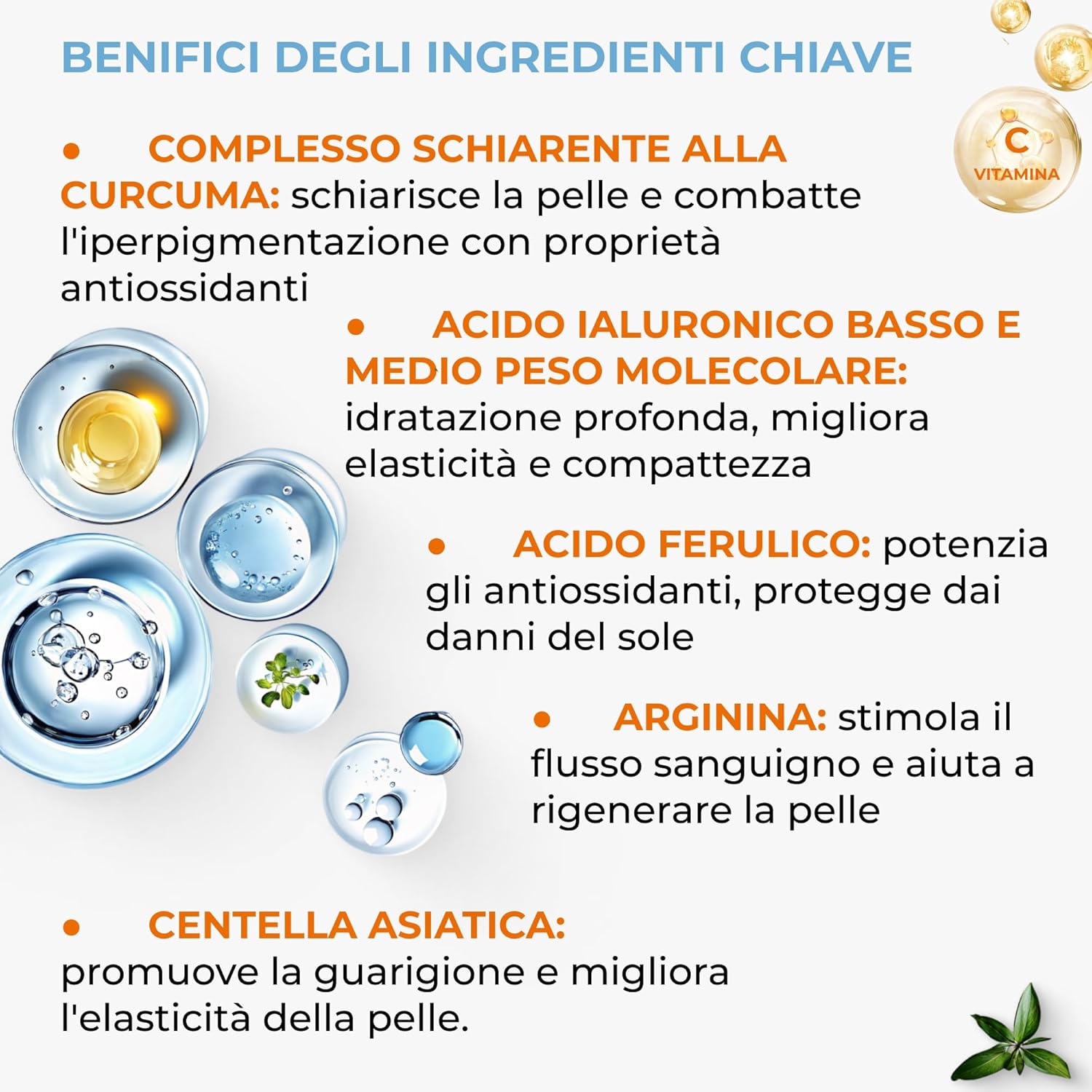 Vitamine C Gezichtsserum met Hyaluronzuur & Ferulinezuur 100ML BIO | Anti-rimpel, Anti-Vlekken, Anti-Aging, Verhelderend | Kurkuma & Centella Asiatica | Natuurlijk | Alle Huidtypes | Made in Italië
