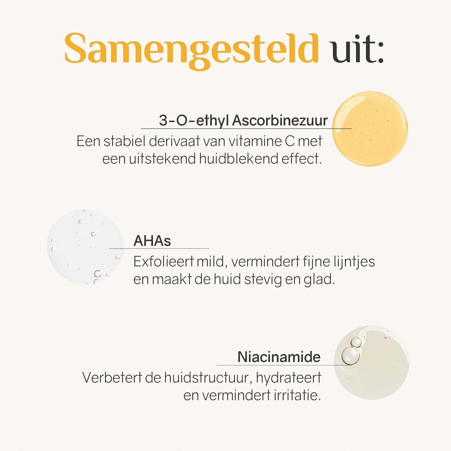 Vitamine C is rijk aan witmakende en antioxiderende eigenschappen, die het huidoppervlak vernieuwen en het een verjongd uiterlijk geven. De formule is ook verrijkt met hyaluronzuur, een vochtinbrenger voor het gezicht, en vitamine B3 die de teint van de huid egaliseert.