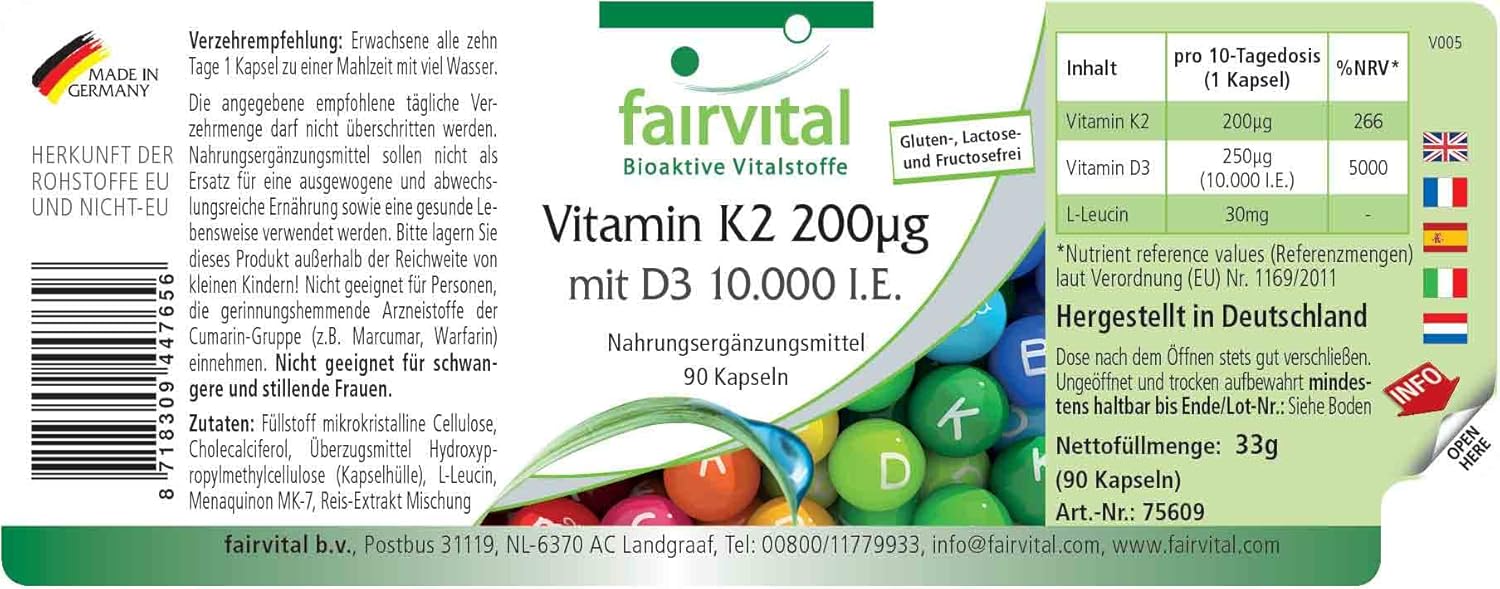 ✔ Fairvital DUITSE KWALITEIT Dagelijkse dosis: 1 capsule om de 10 dagen bevat 200µg vitamine K2 en 250µg (10000 I.U.) vitamine D3. Hoog gedoseerd! Uitstekende prijs-kwaliteitsverhouding! Vitamine K draagt bij tot het behouden van normale botten en een normale bloedstolling. Vitamine D draagt bij tot het behouden van normale botten en tanden alsook een normale functie van het immuunsysteem.