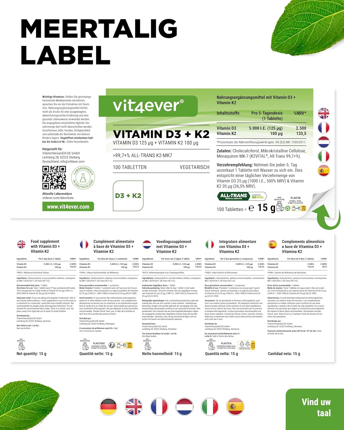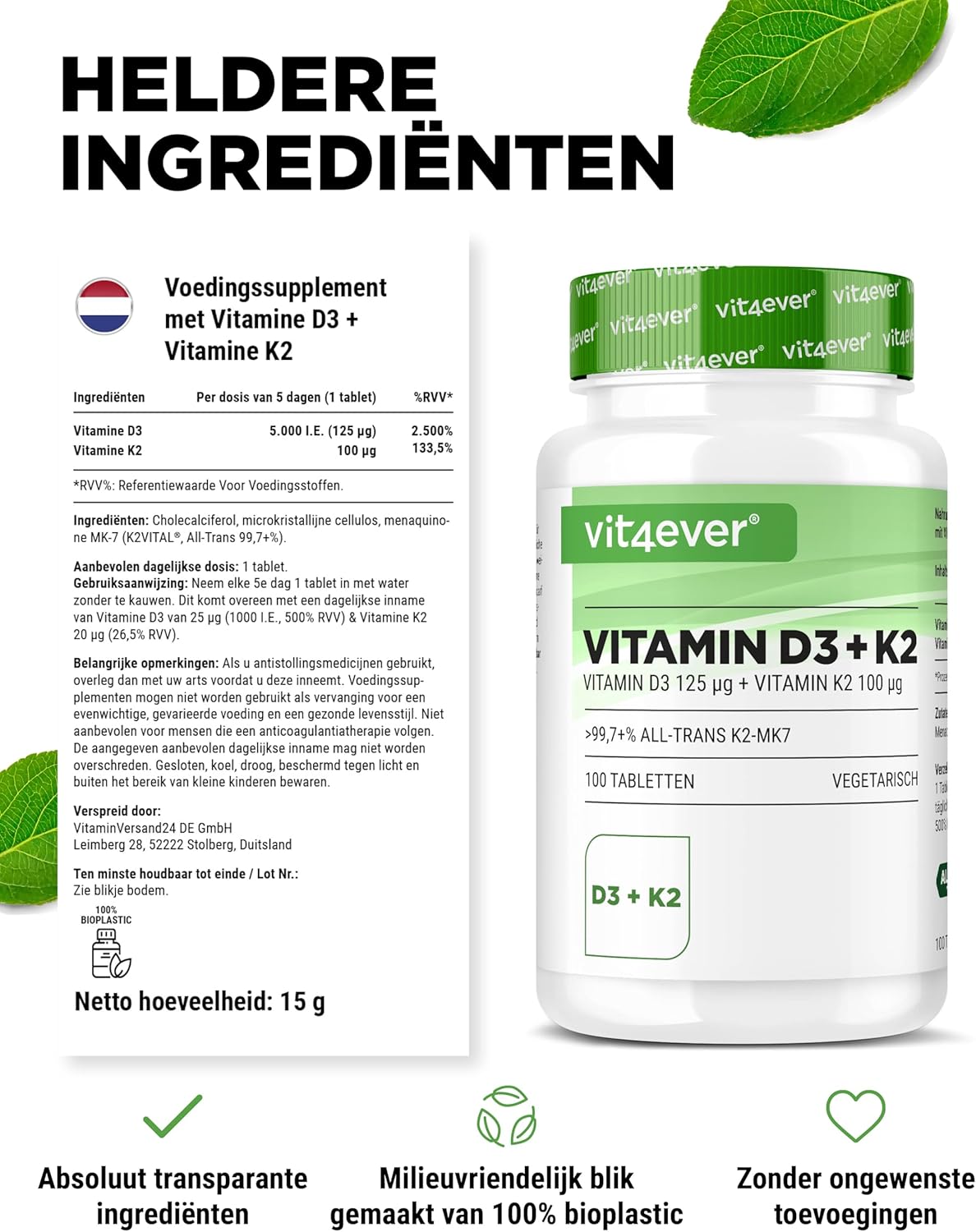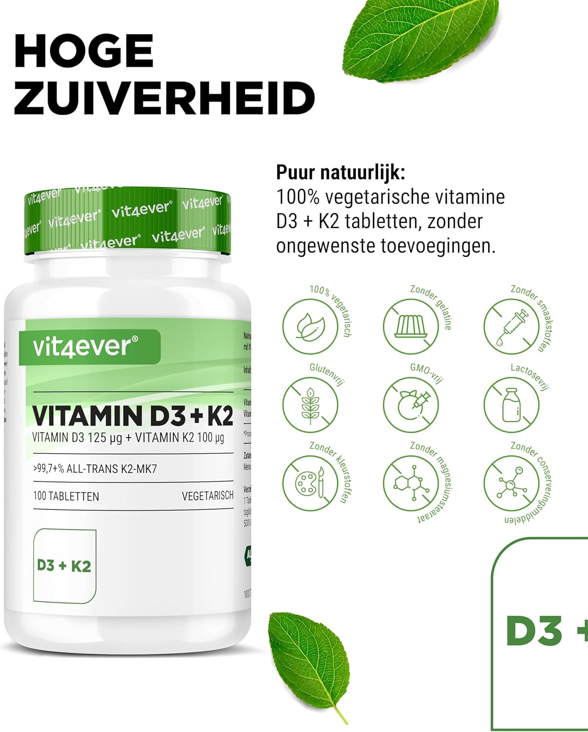 UITSTEKENDE PRIJS: 100 tabletten per blikje. Combinatieproduct met 5000 I.U. vitamine D3 + 200 µg vitamine K2 menaquinone 7 – MK7 per tablet. Gegarandeerd volledig trans-gehalte van ten minste 99,7%.