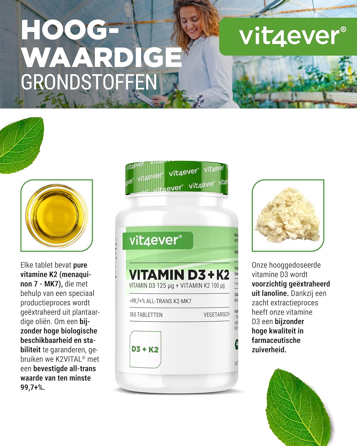UITSTEKENDE PRIJS: 365 tabletten per blik. Combinatieproduct met 5000 I.U. vitamine D3 + 100 µg vitamine K2 menaquinone 7 – MK7 per tablet. Gegarandeerd all-trans gehalte van minstens 99,7%.