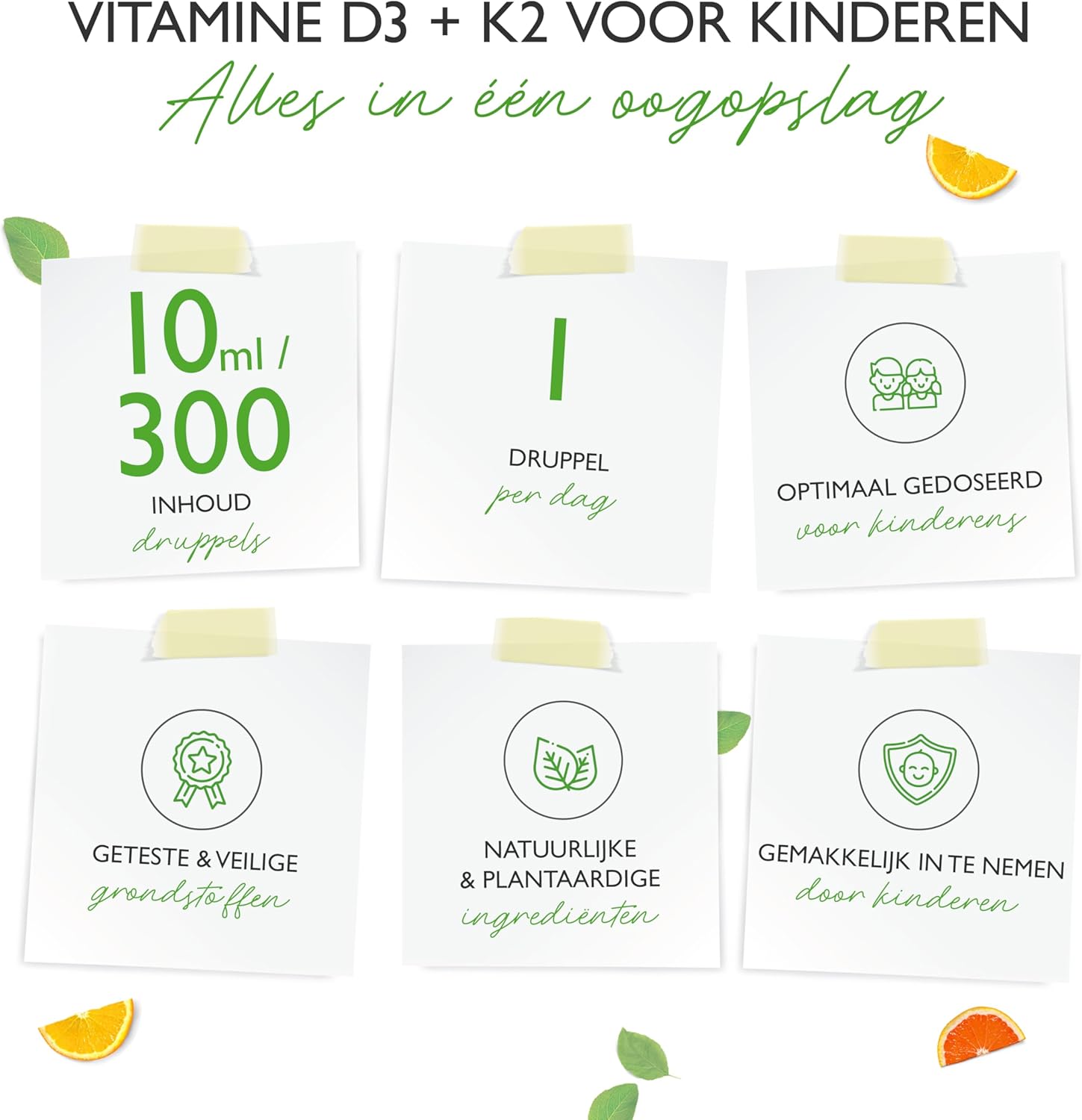 UITSTEKENDE PRIJS-PERFORMANCE VERHOUDING: Vitamine D3 + K2 druppels speciaal ontwikkeld voor kinderen vanaf 4 jaar. Elke dagelijkse dosis van één druppel bevat hooggedoseerde 12,5 μg (500 I.U.) vitamine D3 en 25 μg vitamine K2 (K2VITAL), bestaande uit 99,7+% All-Trans MK-7. Met 300 druppels per flesje (10 ml) biedt dit product een langdurige levering. Voor een optimale stabiliteit en biologische beschikbaarheid zijn de vetoplosbare vitamines D en K opgelost in hoogwaardige MCT-olie van kokosnoot.