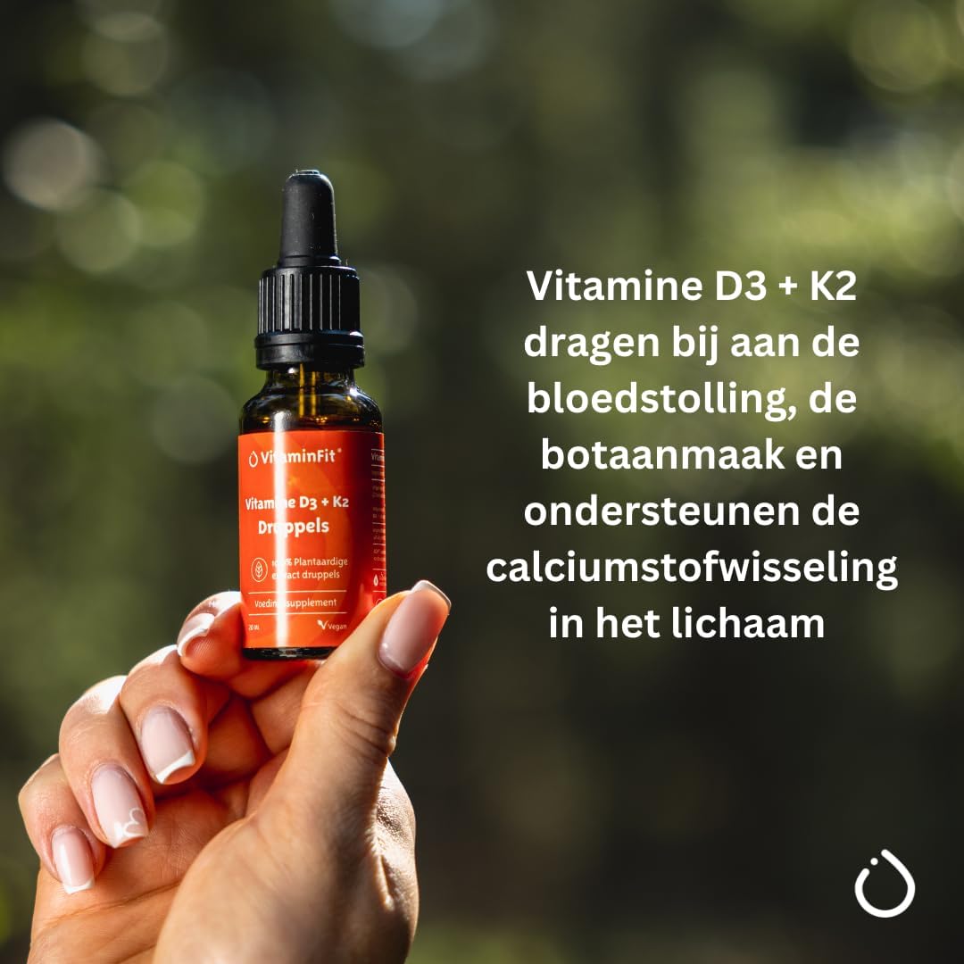 De Vitamine D3 + K2 (MK-7) druppels zijn de best opneembare vorm. D3 + K2 dragen bij aan het behoud van sterke botten, botaanmaak, goed voor de calciumhuishouding en ondersteunt de normale bloedstolling. De Vitamine K en D3 versterken elkaars werking.