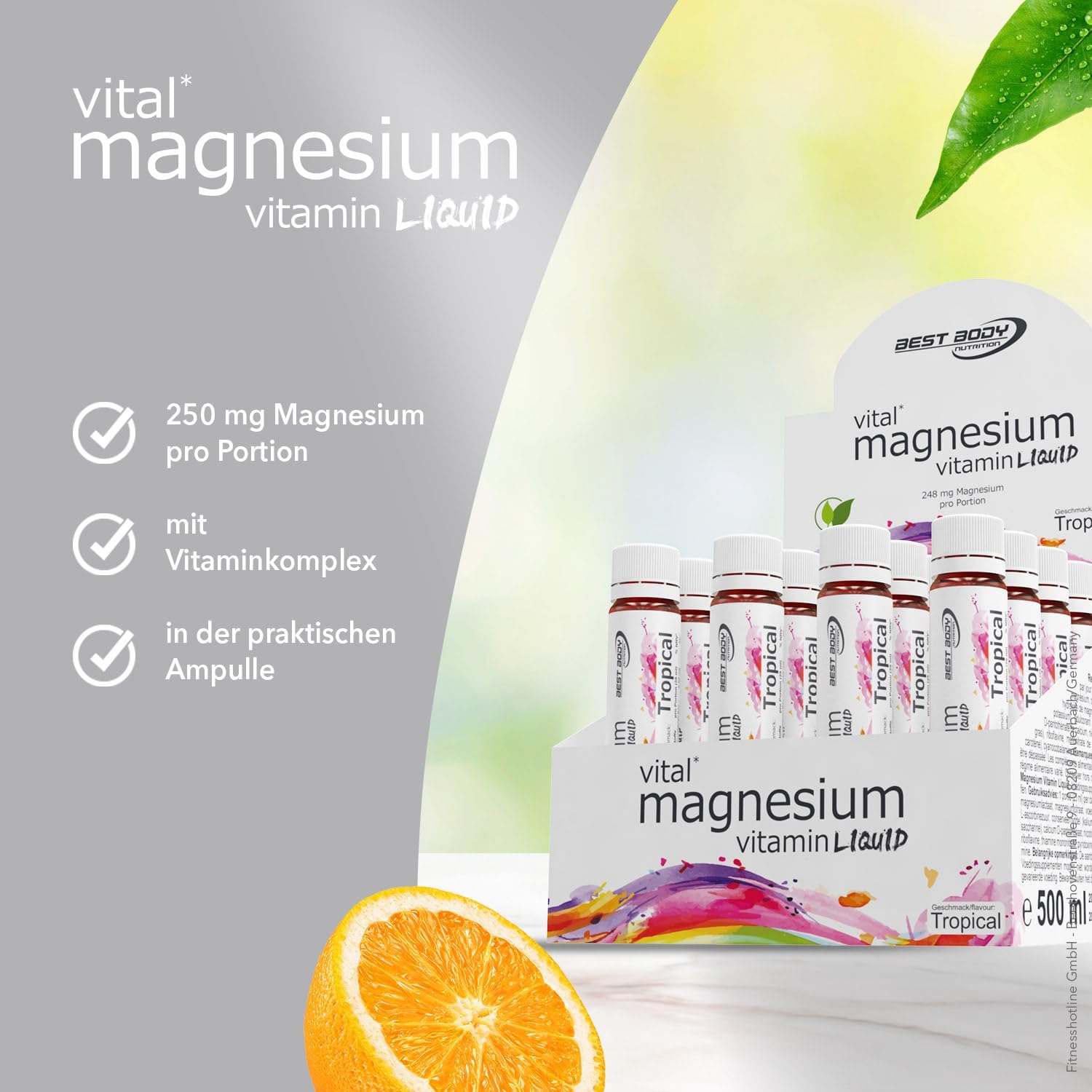 De Magnesium + Vitamine Liquid in de praktische ampul van Best Body Nutrition is een kant-en-klaar voedingssupplement. Het is ideaal voor het reguleren van de magnesiumbalans. Een portie levert 250 mg magnesium en tal van vitamines. Dit dekt 67% van de dagelijkse behoefte aan magnesium en 200% aan vitamines. Naast een hoogwaardige receptuur maken de Magnesium + Vitaminen van Best Body Nutrition indruk met een heerlijk verfrissende en heerlijke smaak.