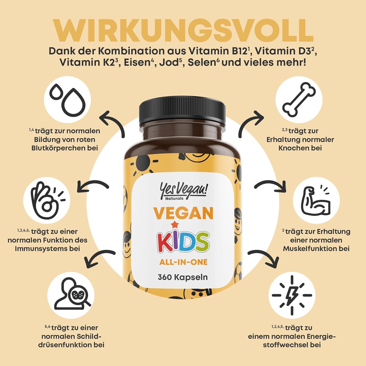 💪 Multivitamine kinderen: met vitaminen zoals B12, D3 en K2 en belangrijke mineralen biedt onze Vegan Kids all-in-one een uitgebreide verzorging voor de groei van je kind. Bovendien is het een goed alternatief voor vitamine gummibeertjes.