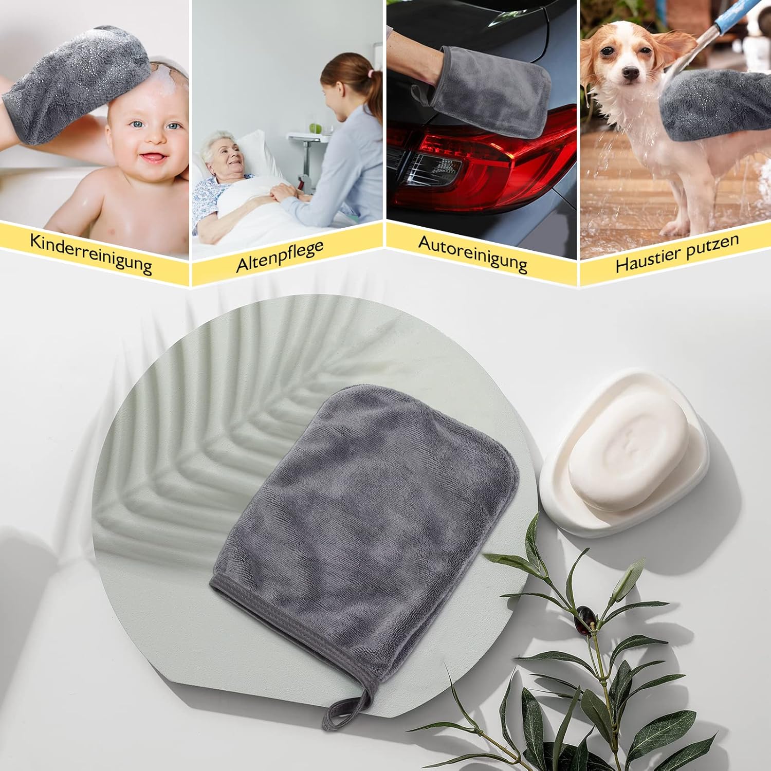 Die Waschhandschuhe werden in einer dünnen Folie geliefert. Beim Öffnen habe ich keinerlei unangenehme, chemische Gerüche wahrgenommen.Die Waschhandschuhe haben eine Größe von ca. 15 x 20 cm und sind äußerst präzise und makellos verarbeitet. Die Borte ist sogar doppelt vernäht und verfügt über eine Schlaufe zum Aufhängen.Die verwendeten Materialien sind von hoher Qualität, robust und langlebig. Ich benutze bereits Waschhandschuhe aus diesem Materialmix und sie sehen auch nach vielen Waschgängen in der Maschine genauso schön aus wie am ersten Tag. Sie sind bisher absolut unzerstörbar.Die Handschuhe sind dick und unglaublich weich. Sie bestehen zu 80% aus Polyester und zu 20% aus Polyamid. Sie können bei 60 Grad gewaschen werden und sind trocknergeeignet. Ich habe sie bei 60 Grad gewaschen und auch in den Trockner gegeben. Sie sind nicht eingelaufen, behalten Farbe und Form und ziehen keine Fäden.Natürlich bleiben sie auch an der Luft trocknend weich, aber wenn man sie nach dem Waschen in den Trockner gibt, werden die Mikroplüschfasern erst richtig flauschig.Ich bin wirklich begeistert und überzeugt. Die Handschuhe reinigen sehr effektiv und entfernen Make-up gründlich. Sie eignen sich hervorragend für Gesicht und Körper.Ein weiterer Vorteil ist ihre dunkelgraue Farbe. Im Gegensatz zu weißen Waschhandschuhen werden sie nach der Maschinenwäsche nicht unansehnlich und “Make-up-Schatten” bleiben nicht dauerhaft sichtbar.Das Preis-Leistungs-Verhältnis von 11,99 €, also knapp 4 € pro Stück, zum Zeitpunkt meiner Bewertung finde ich aufgrund der ausgezeichneten Produkteigenschaften angemessen und gerechtfertigt.