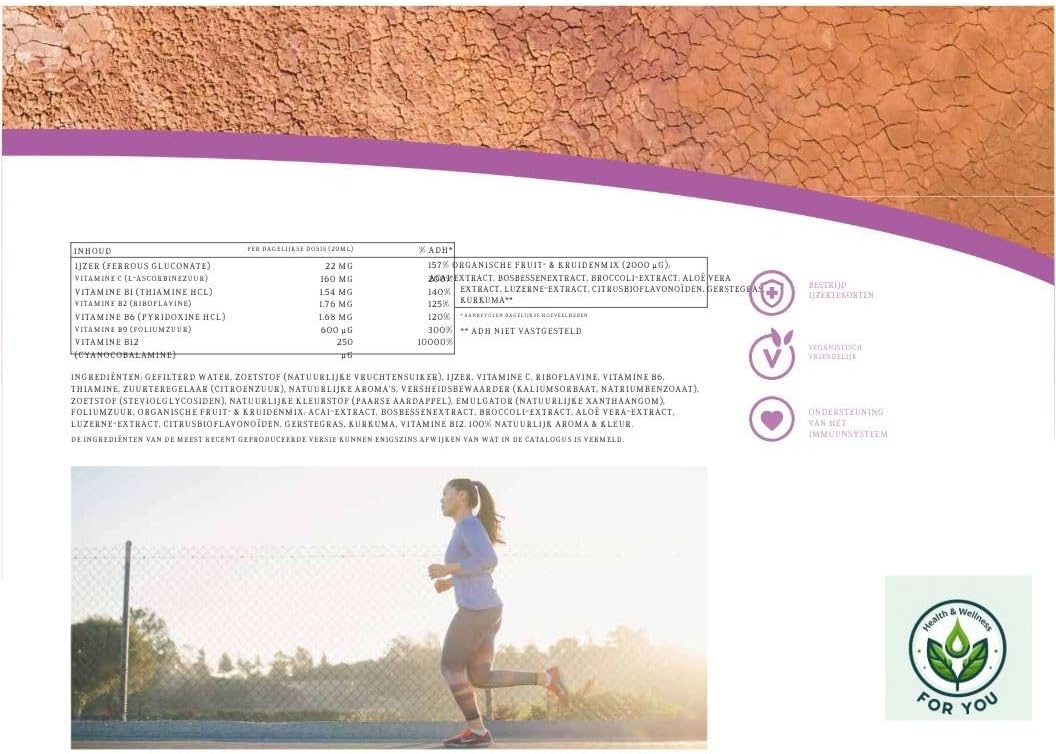 Swedish Nutra Liquid Iron Met zorgvuldig geselecteerde ingrediënten die de vorming van rode bloedcellen, de vorming van hemoglobine, het onderhoud van rode bloedcellen, de vermindering van vermoeidheid en uitputting, de normale energiemetabolisme, de cognitieve functie en het immuunsysteem ondersteunen. Bevat ijzer en de vitaminen C, B1, B2, B6, B9 en B12. Verrijkt met onze biologische fruit- en kruidenmix.