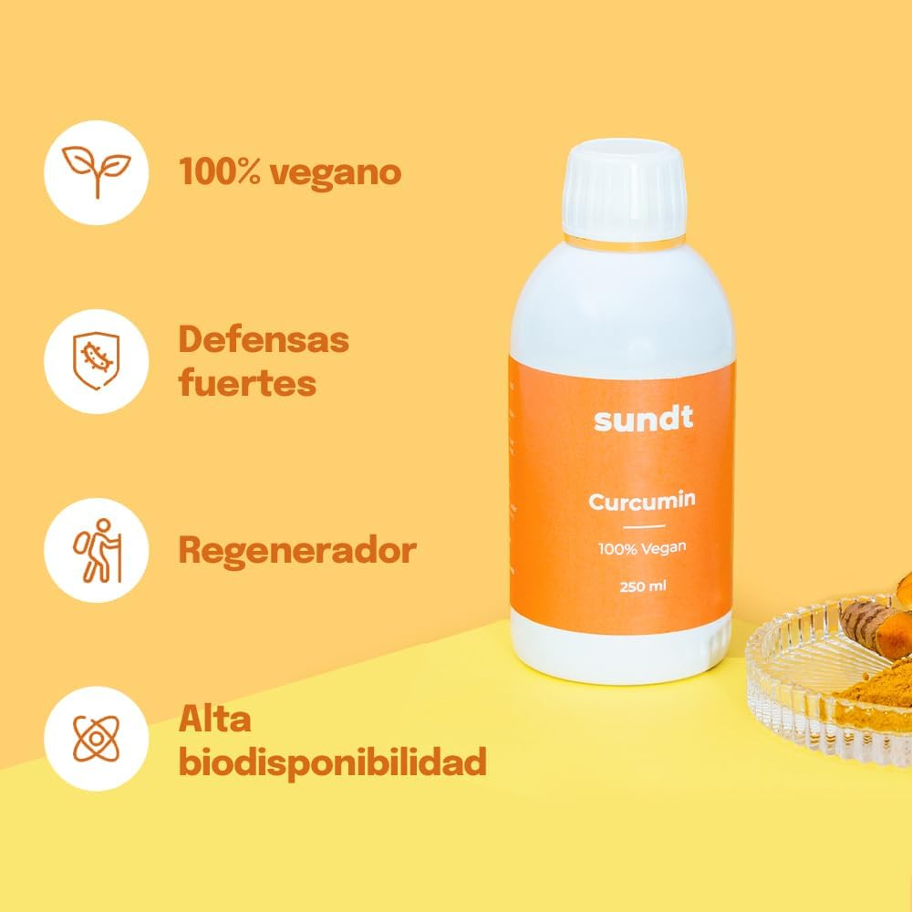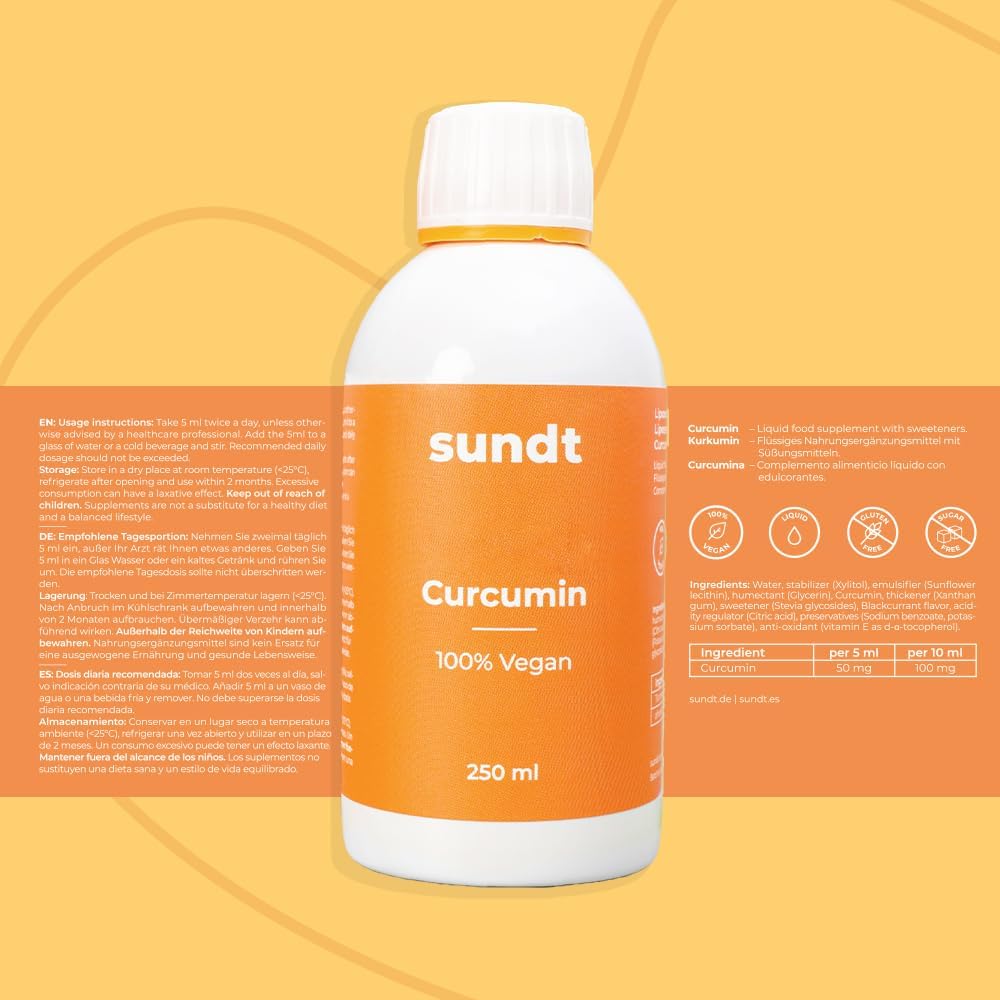 Vloeibare liposomale curcumine als natuurlijke antioxidant tegen ontstekingen – Flesje van 250 ml – 50 doseringen – Vegan en vrij van genetische modificatie – Gemaakt in Europa – Sundt Nutrition® voedingssupplement