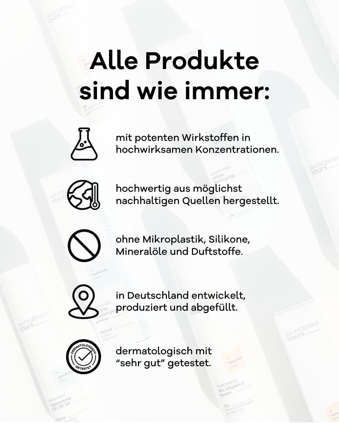 Duurzame formule: bij Skincerely Yours zijn we er trots op 100% veganistisch te zijn. Onze producten zijn vrij van microplastics, geur-, kleur- en conserveringsmiddelen, parabenen, siliconen en minerale oliën. Gemaakt in Duitsland.