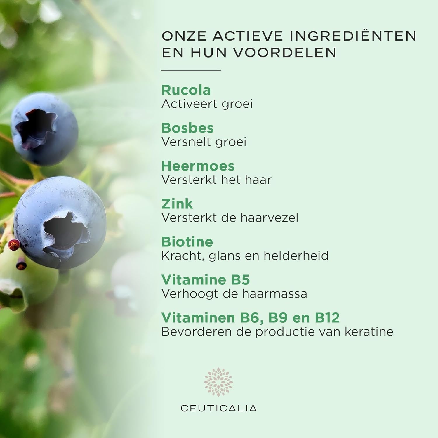 Actief ingrediënt – 2 capsules Positieve effecten Rucola (1600 mg) Voedt de haarfollikels om haargroei te bevorderen Bosbes (30 mg) Activeert de microcirculatie van de hoofdhuid om haargroei te bevorderen Heermoes (225 mg) Versterkt het haar voor meer aangroei Zink (10 mg) Bevordert de productie van keratine, een essentiële bouwsteen van de haarvezels Biotine (440 mg) Geeft kracht, glans en glinstering aan dof haar Vitamine B5 (18 mg) Geeft het haar meer volume en body Vitamine B6 (2 mg) Bevordert de productie van cysteïne, een belangrijke component van keratine Vitamine B9 (3 mg) Bevordert de productie van cysteïne, een belangrijk component van keratine Vitamine B12 (3 mg) Bevordert de productie van cysteïne, een belangrijk component van keratine