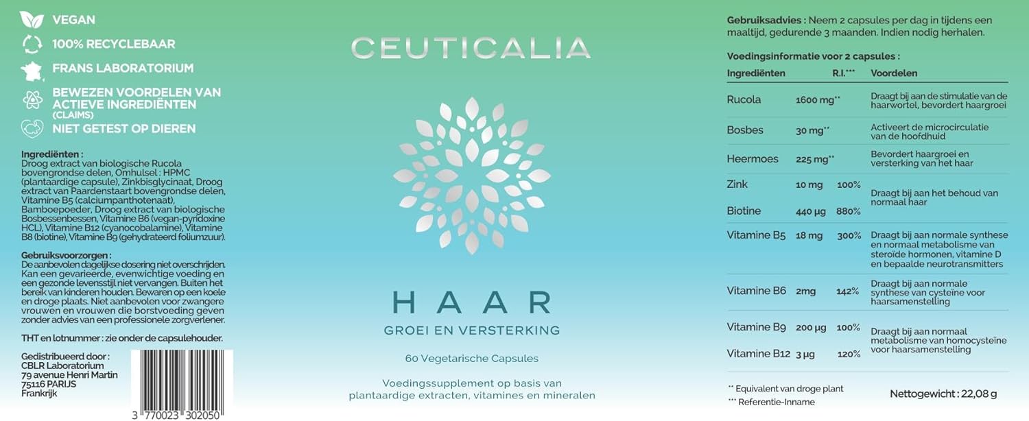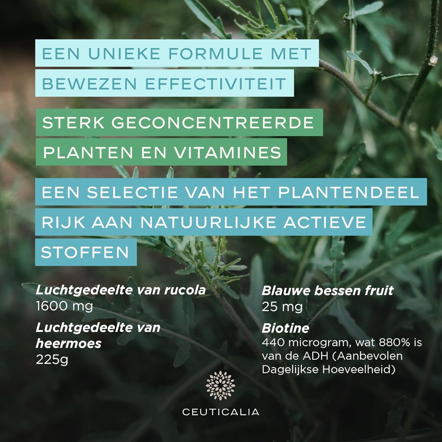 Effectief – Onze unieke formule bestaat uit een optimale combinatie van actieve ingrediënten waarvan de effectiviteit wetenschappelijk is bewezen: Biotine, Rucola, Bosbes, Heermoes, Vitamine B5, B6, B9, B12 en Zink.