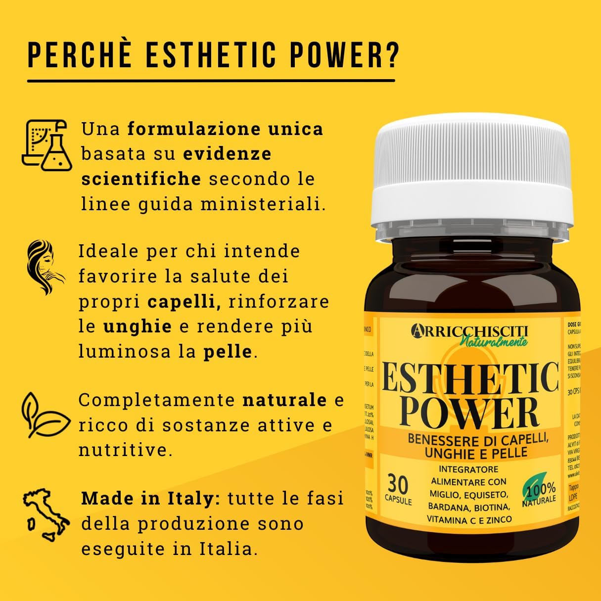 Esthetic Power is een 100% natuurlijk supplement dat is ontwikkeld om haar, nagels en huid van binnenuit te versterken. De geavanceerde, wetenschappelijk bewezen formule levert de essentiële voedingsstoffen om je uiterlijk effectief en duurzaam te regenereren. Sterker, volumineus en gezonder haar. ✅ Duurzame en robuuste nagels. ✅ Heldere, gelijkmatige en gereinigde huid, gemaakt in Italië, gemaakt van hoogwaardige ingrediënten, Esthetic Power is de natuurlijke ondersteuning die je lichaam verdient. De belangrijkste ingrediënten van Esthetic Power en de voordelen: ✔ Beste – het geheim van de haarkrachtrijk aan mineralen en zwavelhoudende aminozuren stimuleert gierst de haargroei, versterkt ze van de wortel en voorkomt haaruitval. Het is een echte natuurlijke haaropbouw. ✔ Equiset: de silicium nagel- en haarbooster. De paardenstaart is een buitengewone bron van silicium, een essentieel mineraal voor de keratinesynthese. Resultaat? Dikkere nagels, elastisch haar en minder gevoelig voor breuk. ✔ Klis: het wapen tegen acne en huidreiniging. Met zijn krachtige reinigende eigenschappen helpt de klis om gifstoffen en onzuiverheden te verwijderen en acne, puistjes en vette huid tegen te gaan. Voor een helderder, gelijkmatig en stralend gezicht. ✔ Biotine – de essentiële voedingsstof voor haar en nagels. Biotine staat bekend als “schoonheidsvitamine”, voorkomt haaruitval, versnelt de groei en versterkt de nagels om te voorkomen dat ze gemakkelijk afbladderen of breken. ✔ Vitamine C – het collageen van je huid vitamine C stimuleert de productie van collageen, het eiwit dat de huid strak, jong en elastisch houdt. Bovendien bestrijdt het oxidatieve stress en voorkomt vroegtijdige huidveroudering. ✔ Zink – het mineraal dat herstelt en beschermt, de basis is voor celvernieuwing, bevordert een gezonde haargroei, versterkt de nagels en houdt de huid vrij van onzuiverheden. Je schoonheid verdient het beste. Begin vandaag nog met Esthetic Power! Wacht niet tot je altijd dunner haar, afbladderende nagels en een stompe gemarkeerde huid ziet. Geef je lichaam het voedsel dat het verdient en vind je natuurlijke schoonheid met Esthetic Power. ✨ Kies Esthetic Power. Kies om te glanzen. ✨