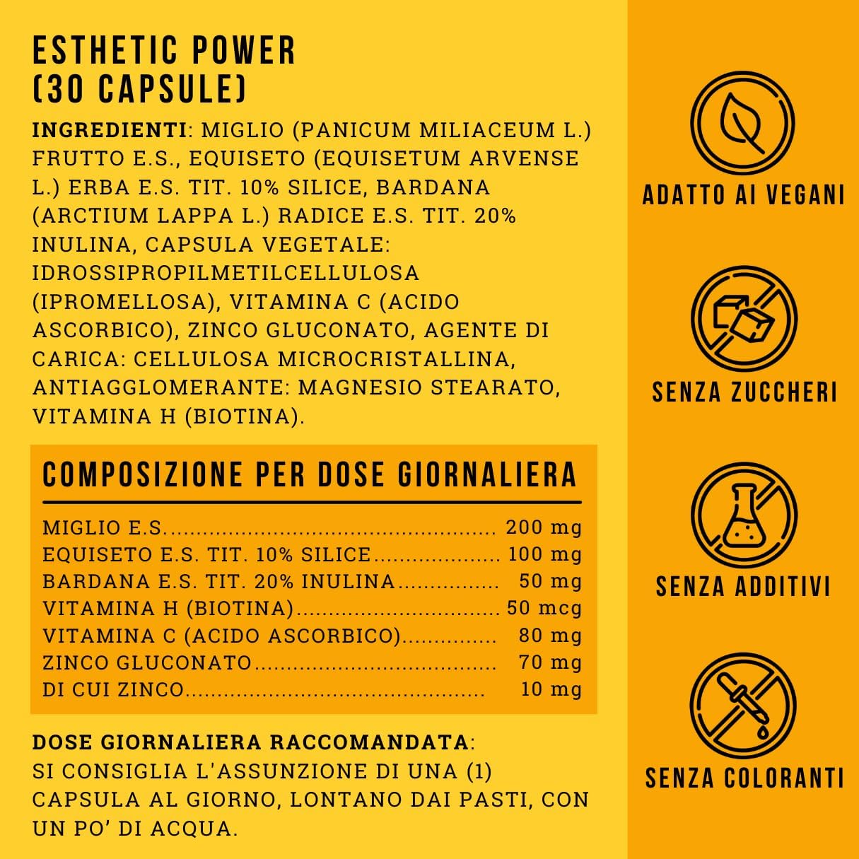 👍 Zeer hoge concentratie werkzame stoffen: in Esthetic Power is er 200 mg gierst, 100 mg paardenstaart, 50 mg klit, 50 µg biotine (vitamine H), 80 mg vitamine C en 10 mg zink.